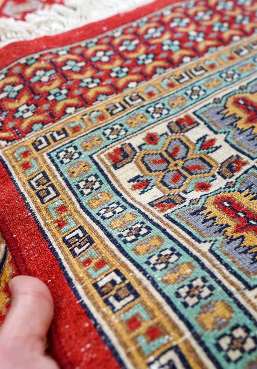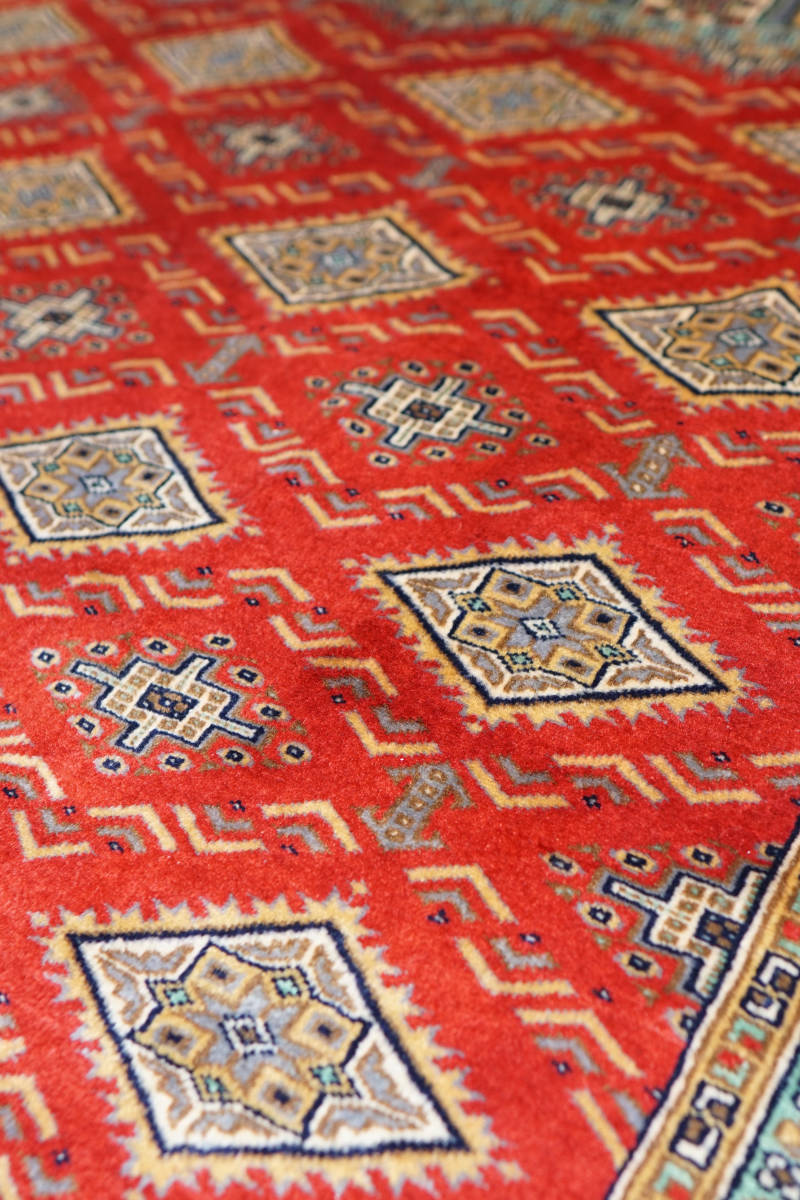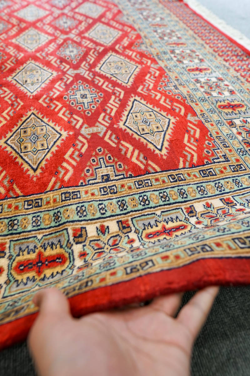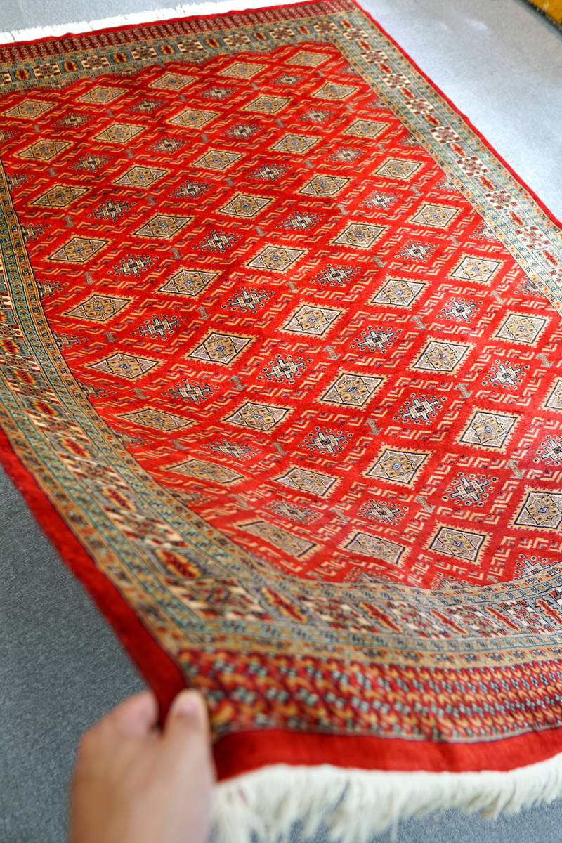 ニュージーランド産の高品質ウールに草木染めし、パキスタンの職人がまごころ込めて手織りした絨毯です。肌触りはなめらかで柔らかく、表面にはハリ・ツヤがあります。