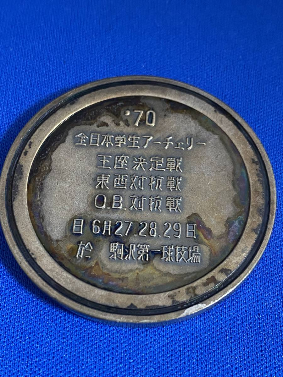 | アーチェリー メダル 1970 全日本学生アーチェリー 王座決定戦 6月27.28.29日 駒沢第一球場 の出品になります。 詳細不明は不明です。 大きさは約4.5㎝ になります。 アンティーク品となりますので、画像を確認の上ご入札をお願い致します。 |