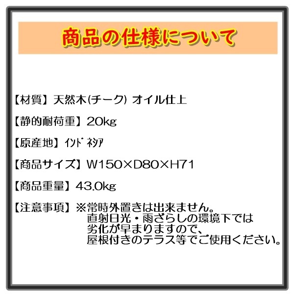 ![]() ダイニングテーブル DGT-333 ◇◆商品の仕様について◆◇ 【材質】天然木(チーク) オイル仕上 【静的耐荷重】20kg 【原産地】インドネシア 【商品サイズ】幅150×奥行き80×高さ71(cm) 【商品重量】43.0kg ◇◆発送について◆◇