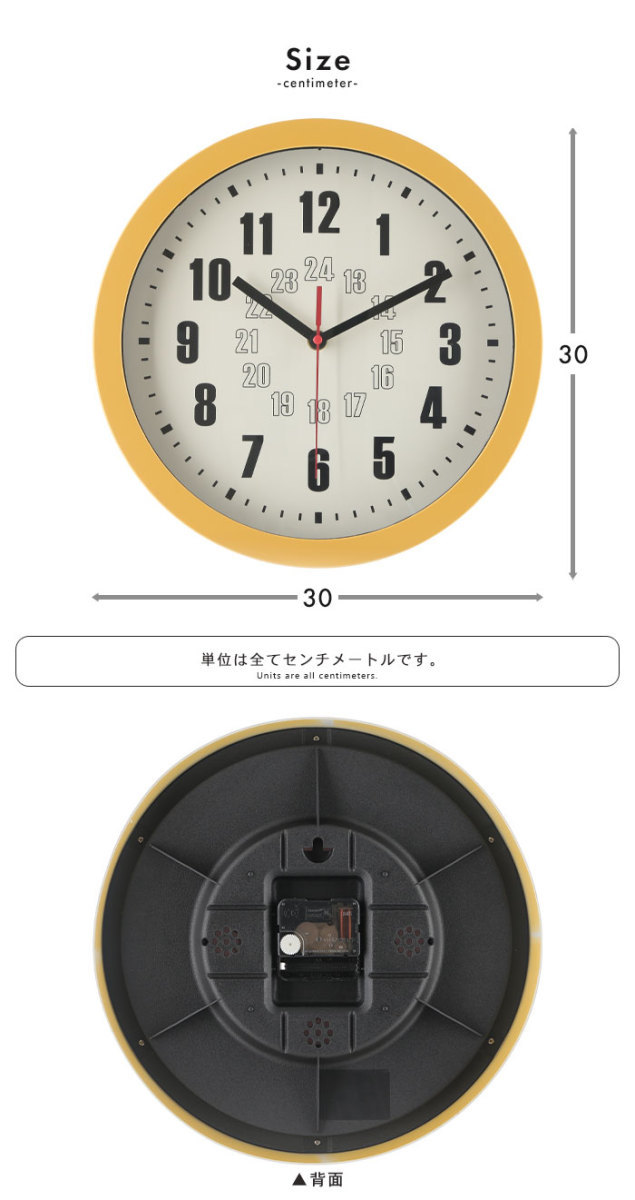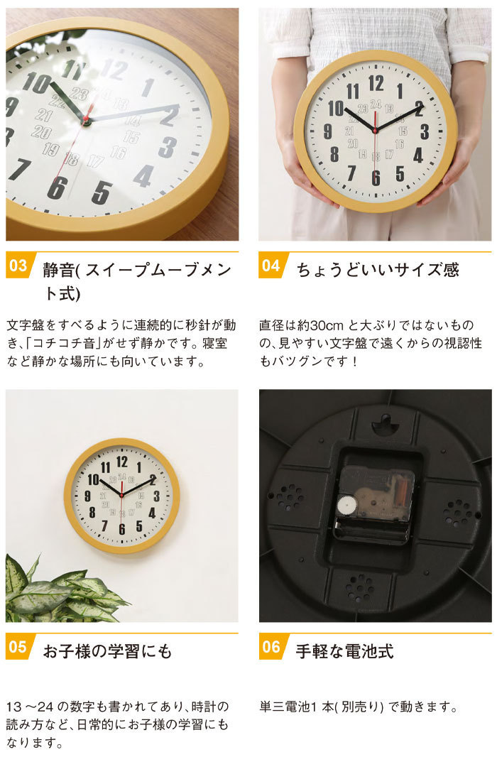 | ◇静音(スイープムーブメント式)の掛け時計。 ◇直径約30cm ◇電池式:単三電池1本(別売り) |