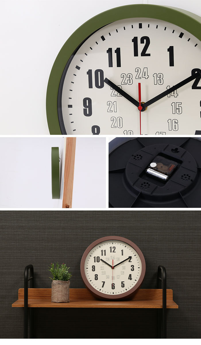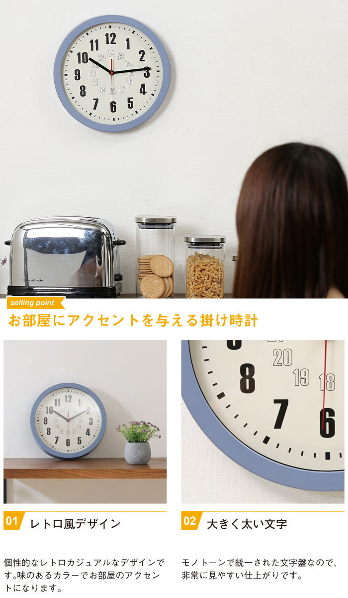| 個性的なレトロカジュアルなデザインです。 味のあるお部屋のアクセントになります。 13~24の数字も書かれており、時計の読み方など、日常的にお子様の学習にもなります。 モノトーンで統一された文字盤なので非常に見やすい仕上がりです。 |