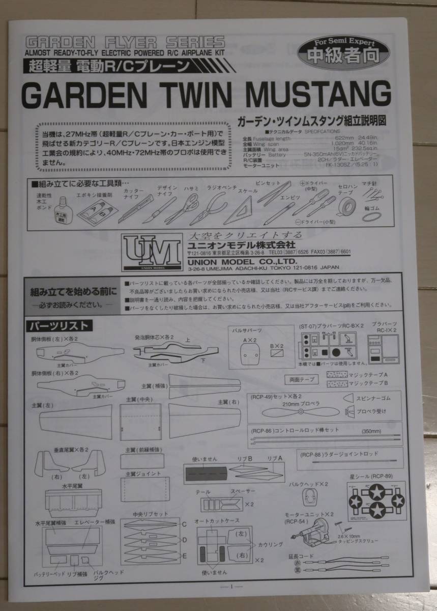ユニオンモデル ガーデン・ツインムスタング プロポ付フルセット カラー印刷済組立キット(RCK-26)です。