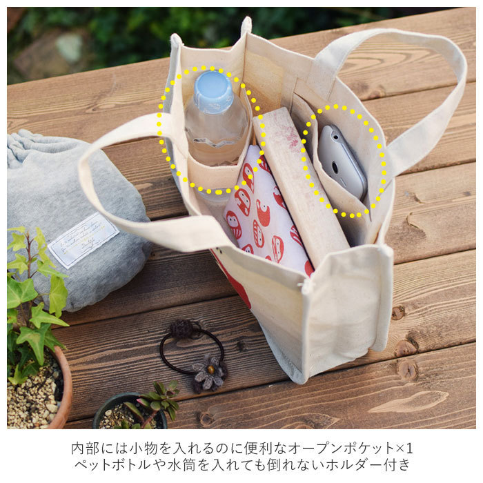 商品説明 | ・丸みのある底部とユニークなプリントがお洒落♪ちょっとそこまでのお出かけにも、ランチバッグにも使えるミニトート。 ・内部には小物を入れるのに便利なオープンポケット×1と、ペットボトルや水筒を入れても倒れないホルダー付き。ランチボックスも水平に入れられる広めのマチがとっても便利★ ・ユニークなプリントはお洒落女子の「はずし」アイテムとしても優秀。シンプルカジュアルなコーデのアクセントとしても♪ | |||||||||||||