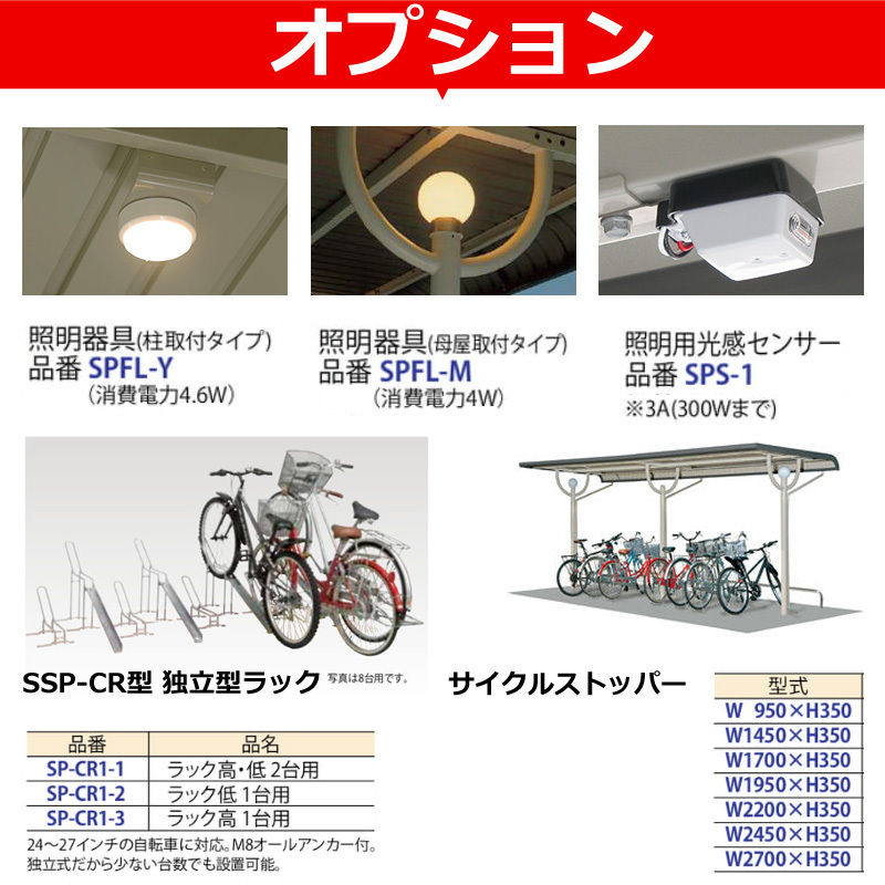| 商品詳細 | この度は数ある商品の中から当商品を閲覧頂きまして有難う御座います。 販売価格 166,760円(送料・税込み) ●頑丈なガルバリウム鋼板屋根で強風、積雪にも耐えて自転車を守ります。 ●一般的なポリカ屋根タイプに比べて2倍の積雪40cmまで対応可。 ●腰板や照明器具などオプションと一緒に設置すると便利です。 ●骨組みはサビに強い高耐食溶融めっき鋼板ZAM仕様。 ●コストパフォーマンスにも優れ、店舗やマンション、アパートなどの駐輪場など、 さまざまな敷地条件に合わせて設置が可能です。 品番:SP102YPU-K サイズ: 屋根間口3040mm(柱芯々間口2500mm)×屋根奥行き2000mm 高さ2283mm 駐車台数:5台(目安) 柱の施工方法:柱埋め込みタイプ 耐積雪荷重:一般型1200N/m平方(120kgf/m平方) 耐風圧強度:Vo38(m/s) 屋根種類:ガルバリウム鋼板 骨組み:高耐食溶融めっき鋼板ZAM 重量:121.1kg 樋:標準装備 照明:オプション 柱位置:センター柱 柱形状:丸柱 屋根:後アール(R) 柱・骨組色:タウングレー 化粧板色:スレートグレー 屋根板色:タウングレー オプションにて腰板・照明器具・サイクルストッパー・自転車ラックがあります。 追加棟の設定も御座いますので横連結も可能です。 ご希望の場合は、お気軽にお問い合わせ下さい。 【ご注意】 ・垂直積雪量、および基準風速は自治体ごとに細かく決められています。 各都道府県庁または各市町村役場までご確認下さい。 ・耐風圧強度は、規格品の値です。奥行延長やオプションの腰板取付等の条件により 変わります。 SP102YPU-K 仕様図はこちら SP102YPU-K 梱包明細はこちら SP102YPU-K 組立説明書はこちら SP102YPU-K 基礎図はこちら SP102YP-K 取扱説明書はこちら |