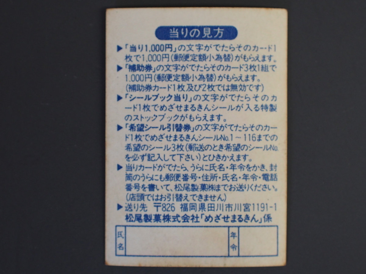 | 商品説明・コメント | 松尾製菓(チロル)、めざせまるきんの「まる字シリーズ」です。 当時、大きい50円型のチョコにオマケシールが付いたビックリマンの二番煎じを狙ったチロルのシールシリーズです。 シールをめくり当たりが出るとお小遣い1000円が貰える大盤振る舞い企画が有った為、真ん中のシール部の剥離が有るかもしれませんが保証範囲外です。 当時の子供たちが少ないお小遣いを工面してこのまるきんで一攫千金を夢見て購入しておりましたが今考えるに子供の宝クジの様な物だったのかもしれません。 アタリが出なかった為、宝くじに匹敵する程の当背率では無いか?、本当にアタリが有るのか?との疑いの声が上がって居た程ですが夢が有ったシールシリーズで有った事は事実です。 大事に保管されていた当時物のシールでは御座いますので年式にしては綺麗かもしれませんがシールに傷、汚れ、痛み、しみ、加工、折れ、劣化は御座いますのでジャンク扱いノークレーム、ノーリターンでの取引を希望致します。 当時物のシールとなりますので現存も少なくなり中々市場に現れる事が無くなって来ましたのでマニア必見です。 商品の仕様の詳しくは御自身でお調べ頂きます様にお願い致します。 古いシールになりますので全てに於いてオリジナルを保証する物では御座いません。 状態に尽きましては写真にて御確認頂けます様御願い致します。 写真では御確認頂けない不具合等もある前提で原則ジャンク扱いにて御考慮下さい。 上記の通り、原則瑕疵担保責任はお受け致しませんので御了承下さいます様御願い致します。 上記の条件を御理解頂けない方の入札はお断り致します。 |