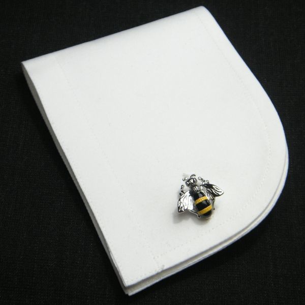 黒い瞳が可愛らしく、黒と黄色のお腹がカラフルなアクセントに、そしてシルバーの羽がキラリ☆と輝くミツバチのカフスです。
