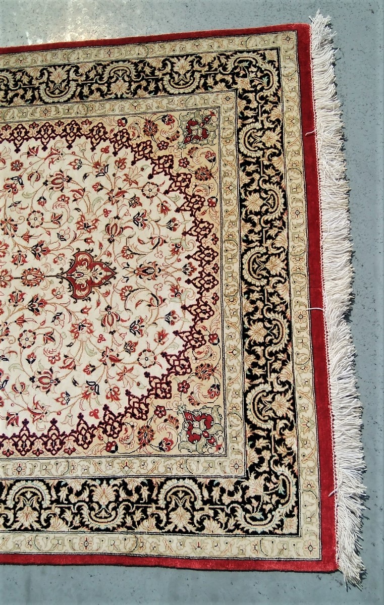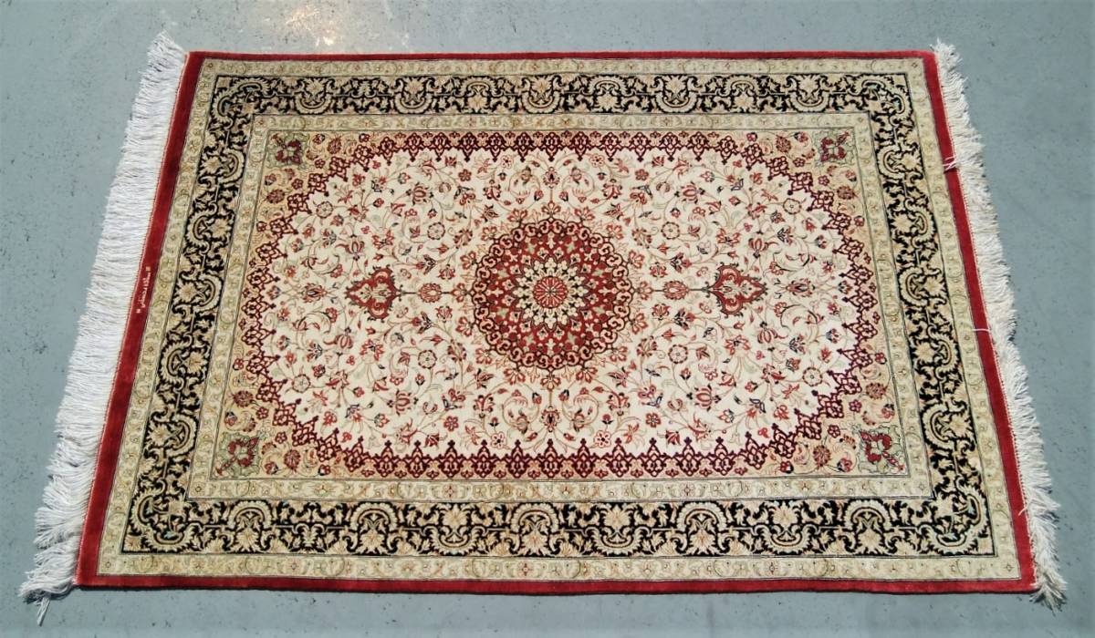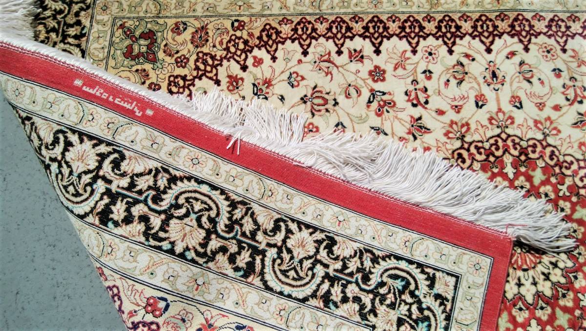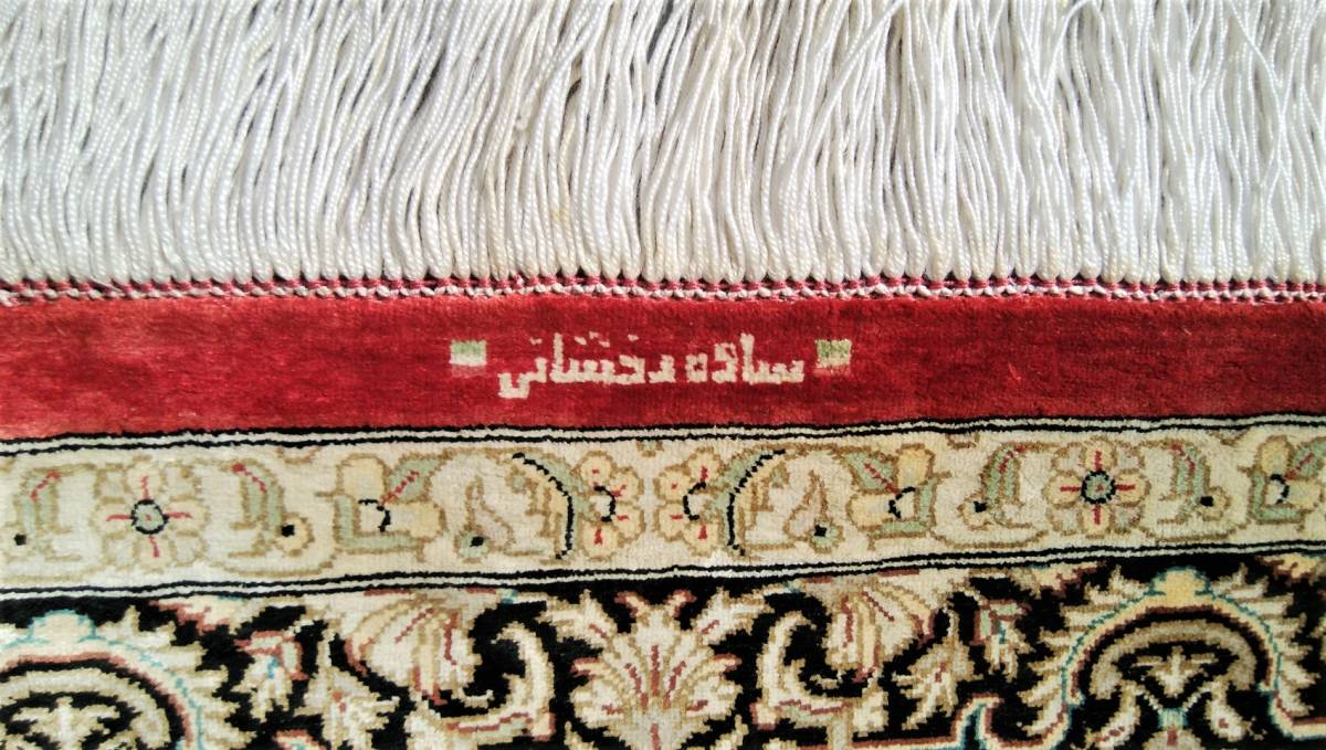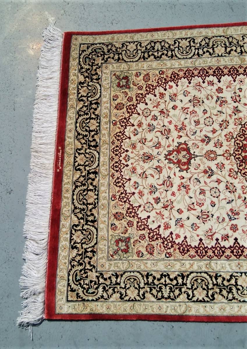 イランのクムのラクシャニ工房で職人の手織りで作られたメダリオン文様の新品未使用在庫品です。