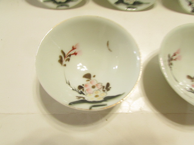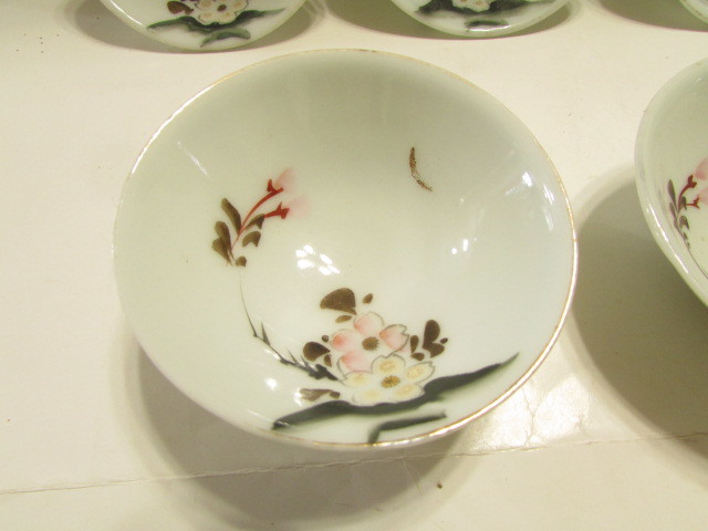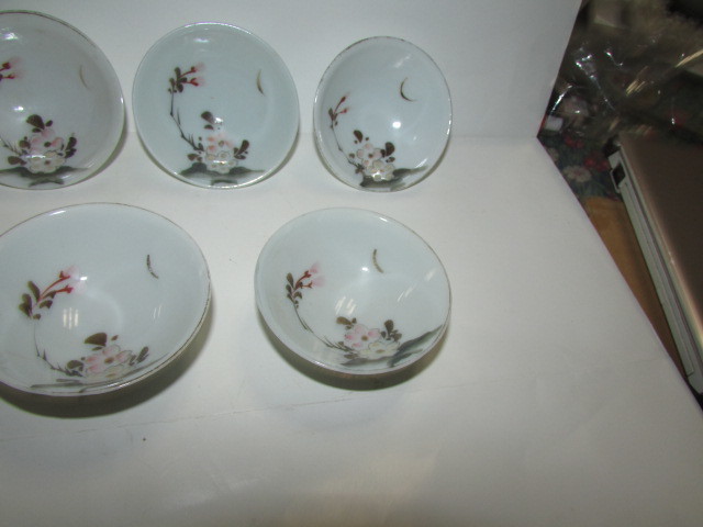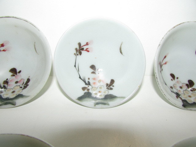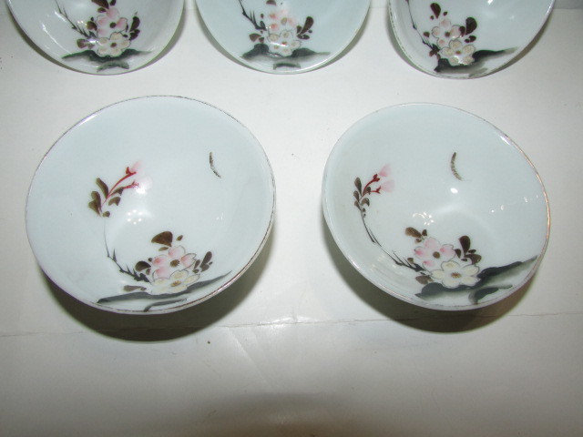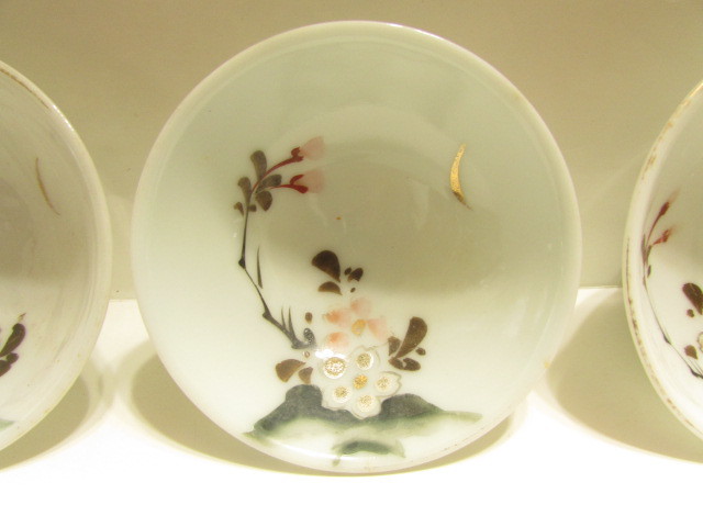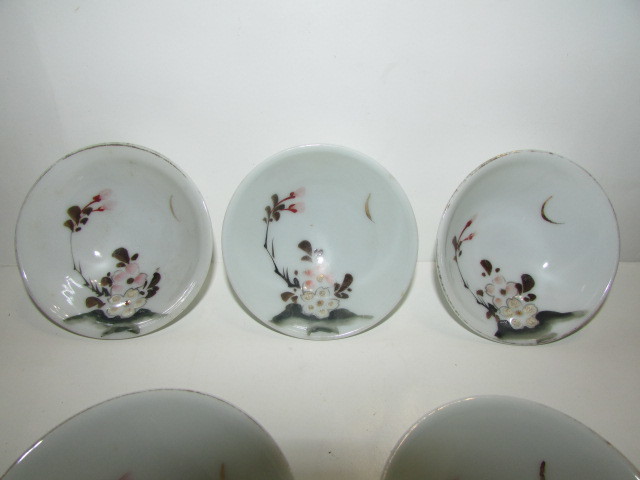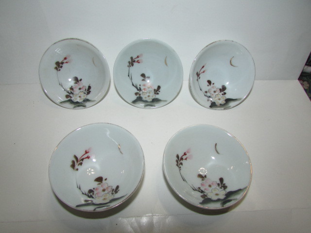( 会津若松・旧家・蔵出し ) 明治時代 ( 古い時代の味わいのある盃・5客・手描き金彩三日月に桜模様 )・貴重・珍品