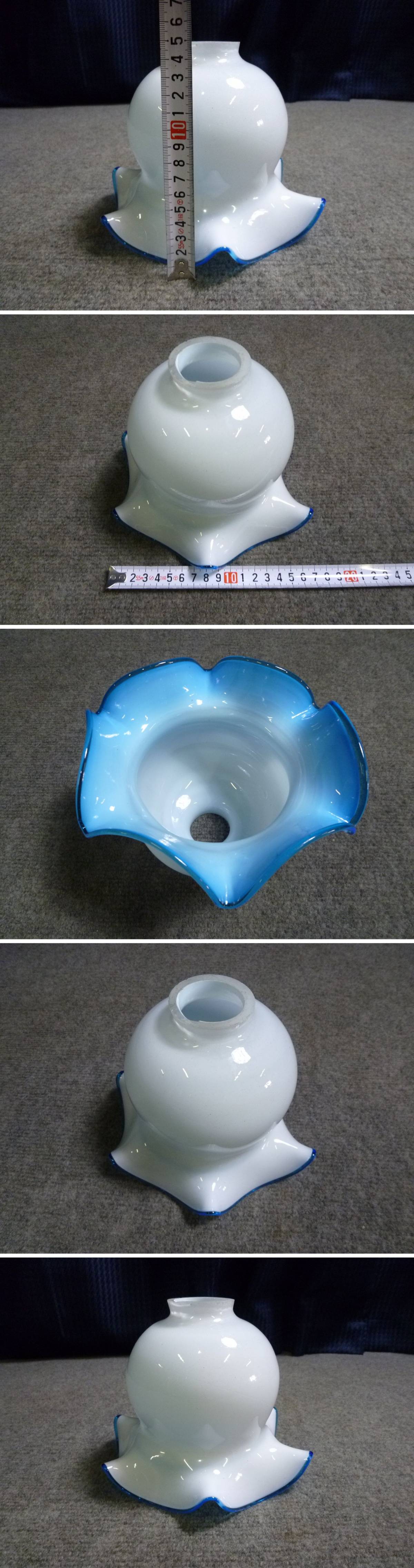 ▲ 詳細不明 ? ランプシェード チューリップ型 フリル ガラス ブルー 乳白 電傘 電球傘 照明器具 明治 ? 大正 ? ▲の出品となります。