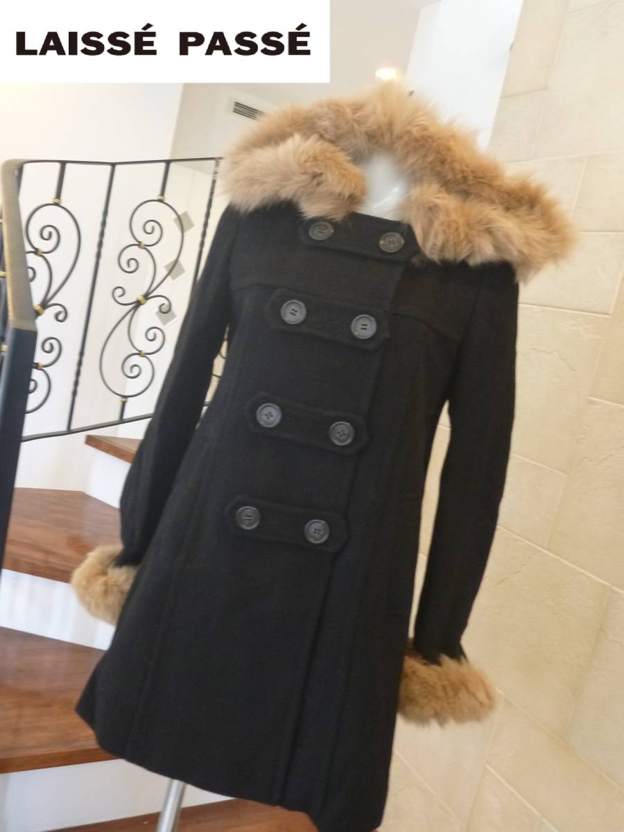 5万 超美品 LAISSE PASSE(レッセ・パッセ)★黒 ブラック フォックスファー・フード取外し可能 コート ノーカラーコート 36 S相当