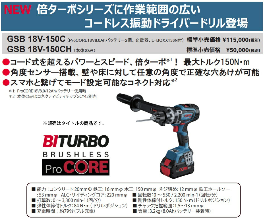 ボッシュ BOSCH18Vコードレス振動ドライバードリルGSB18V-150CH本体のみです。※バッテリー・充電器・ケースは別販売品です。■特長・コード式を超えるパワーとスピード、倍ターボ(ProCORE18V8.0/12Ahバッテリー使用時)! 最大トルク150N・m・角度センサー搭載、壁や床に対して任意の角度で正確な穴あけが可能・スマホと繋げてモード設定可能なコネクト対応(本体のみはコネクティビティチップGCY42別売)■仕様・能力:コンクリート:20mmφ 鉄工:16mmφ 木工:150mmφ ネジ締め:12mmφ 鉄工ホールソー:53mmφ ALC・サイディングコア:220mmφ・回転数:0~550 / 2,200 min-1(回転/分)・打撃数:0~3,300min-1(回/分)・剛性体締付トルク:150 N・m(ドリルポジション)・弾性体締付トルク:84 N・m(ドリルポジション)・チャック把握範囲:1.5~13 mmφ ・充電時間 :約79分(フル充電) ・質量:3.2kg(8.0Ahバッテリー装着時)