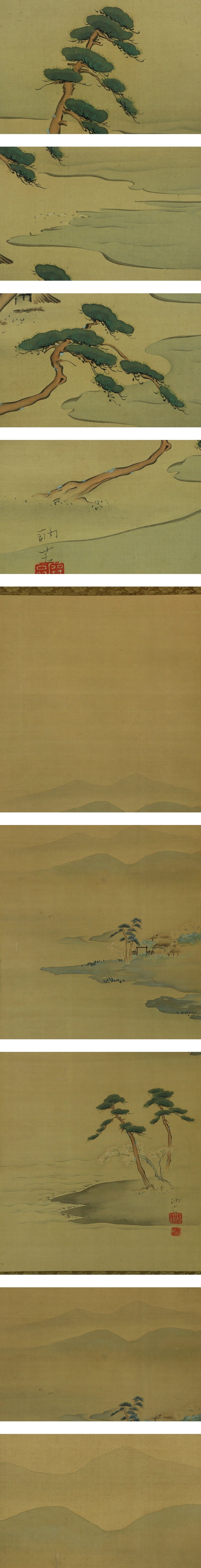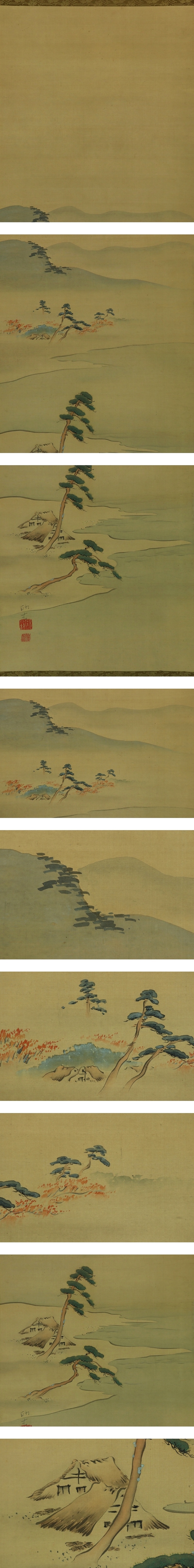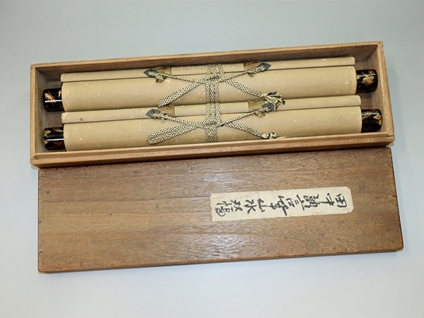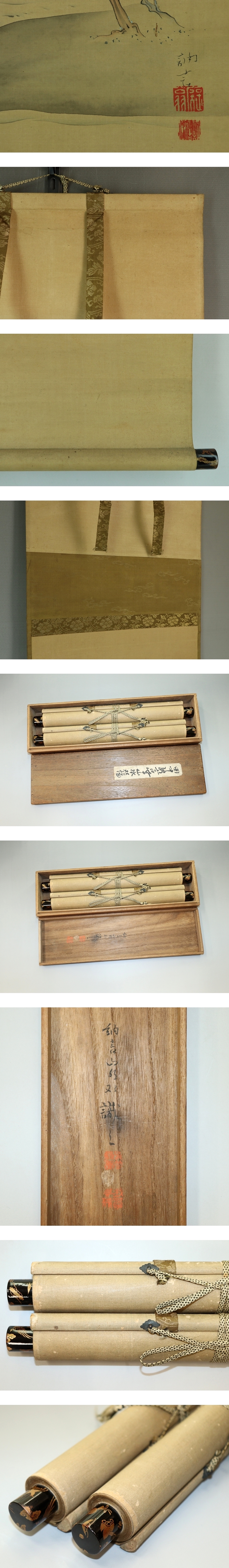 田中訥言 たなか-とつげん(1767-1823) 江戸時代後期の絵師。 尾張国名古屋の出身。名は敏、字は虎頭。別号は痴翁、得中、過不及子、晦存、求明など。 幼少時、日蓮宗の寺に入門し、のちに比叡山延暦寺で天台宗を修める。 画を狩野派の石田幽汀に学び、幽汀死後は還俗して土佐派の土佐光貞の門に入る。 復古大和絵の祖として知られる。門下に浮田一蕙・渡辺清らがいる。 本紙は、染み、汚れ、軽い折れ、皺、ヤケがあります。 表装は、染み、汚れ、折れ、皺、くすみ、虫食い、ほつれ、生地剥れ、軸先に傷があります。 【サイズ】 作品 横約33.5cm×縦約97cm 表装 横約35.5cm×縦約171cm |