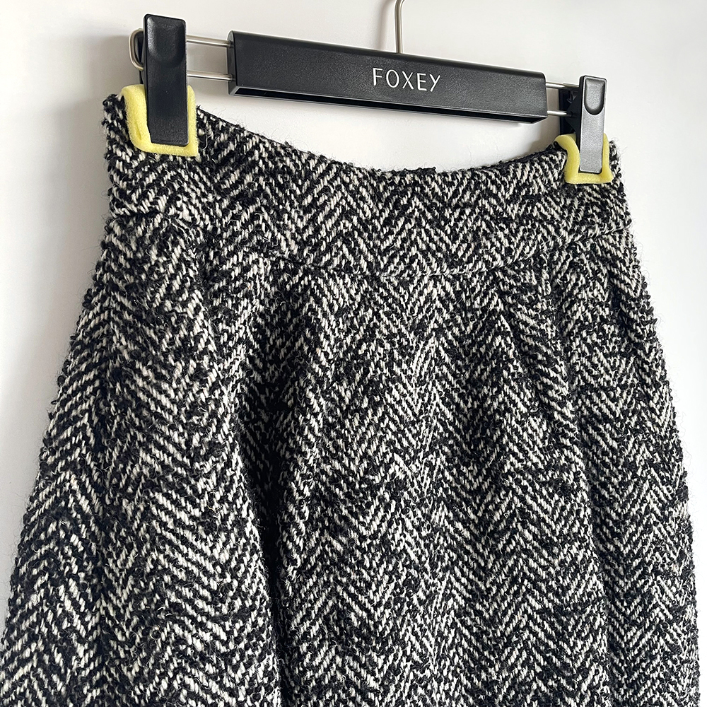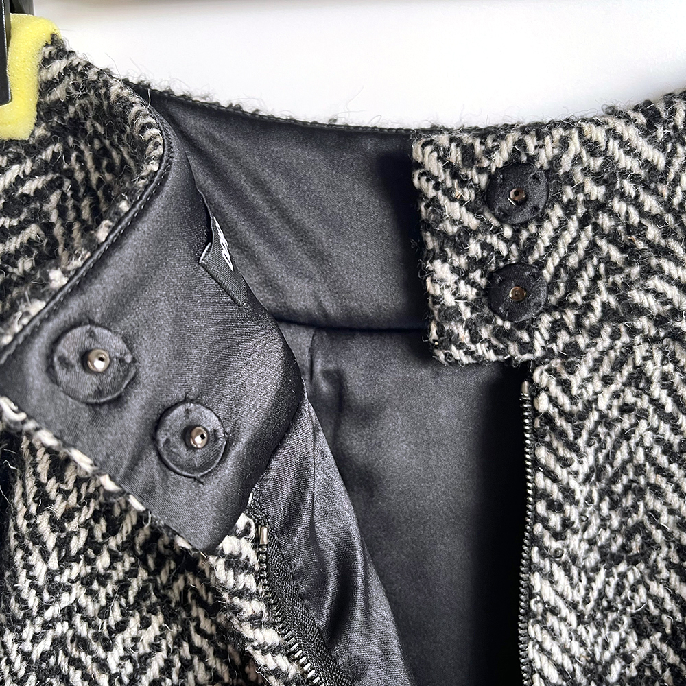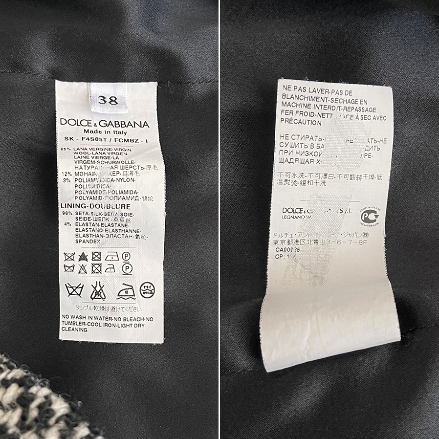ドルチェ&ガッバーナのブークレツイードスカートです。 カタログに掲載され、人気だったお品です。 バージンウール、モヘアなどをミックスした起毛感のあるモノトーンツイード。 ブークレツイードで立体感のある生地です。 ふんわりしたコクーンとフレアの中間のような、上品で美しいシルエットです。 国内直営店にて購入、ドルチェ・アンド・ガッバーナ・ジャパン正規品です。 ・バックスナップボタン、バックファスナー開閉 イタリア製 ●サイズ:38(日本サイズ7号相当) ●実寸:ウエスト幅32.5cm、着丈60cm (平置きにて採寸。多少の誤差はご容赦ください。) ●素材:バージンウール85%、モヘア12%、ナイロン3%(裏地)シルク96%、スパンデックス4% ●カラー:ブラック系 ●定価:15万円程 ●状態:3回ほど、いずれも短時間着用。 大事にしていたものですので、ほとんど着用なく綺麗です。 高級店にてドライクリーニング済みです。 表・裏共に、汚れや難などは見あたりません。 品質表示タグの印字が消えている部分は、セキュリティタグの剥がし跡です。 | |||