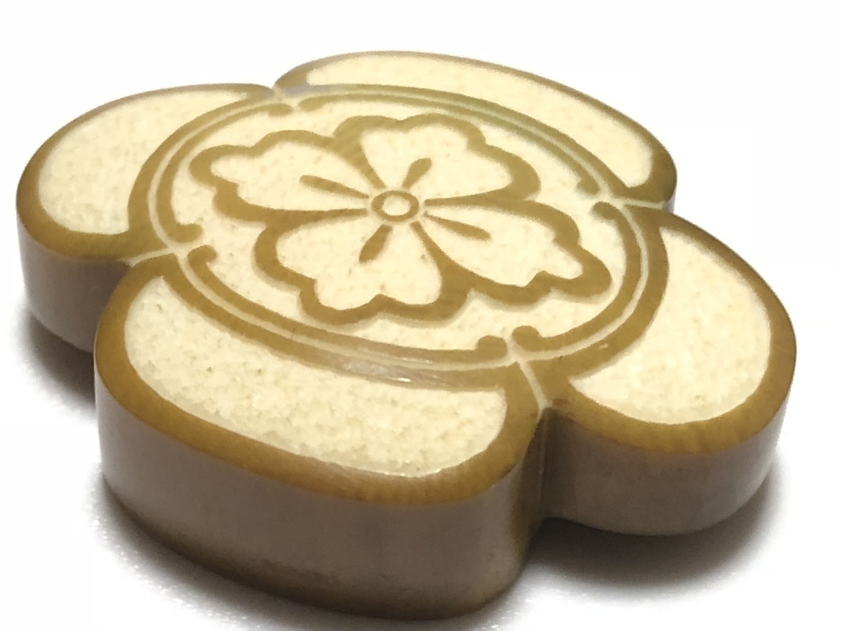 アンティークの浮き彫り、彩色を施した、木瓜紋細工の帯留めです。作者、松月の刻印があります。美品、共箱付属です。 縦2.5㎝、横3.1㎝、厚さ8㎜、重さ6.2g