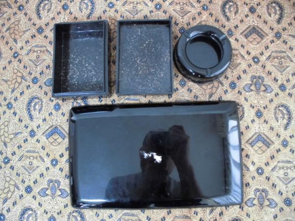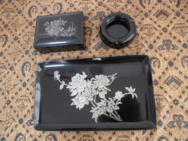 <商品説明>多分木製(水に入れたら浮いたので)。傷みなし。<サイズ>トレー28×17センチ・煙草入れ12.5×9×4.5センチ・灰皿9.5×3センチ【平成29年5月24日出品】