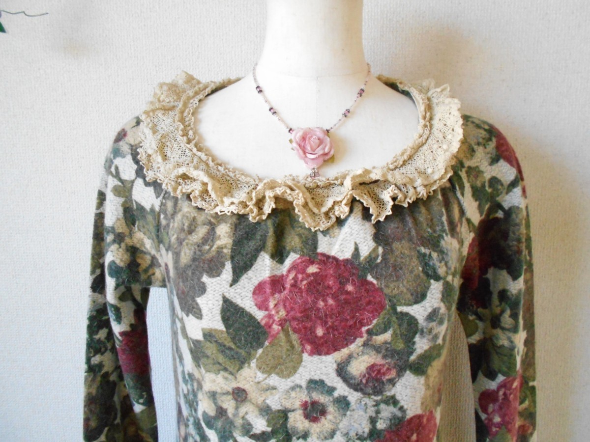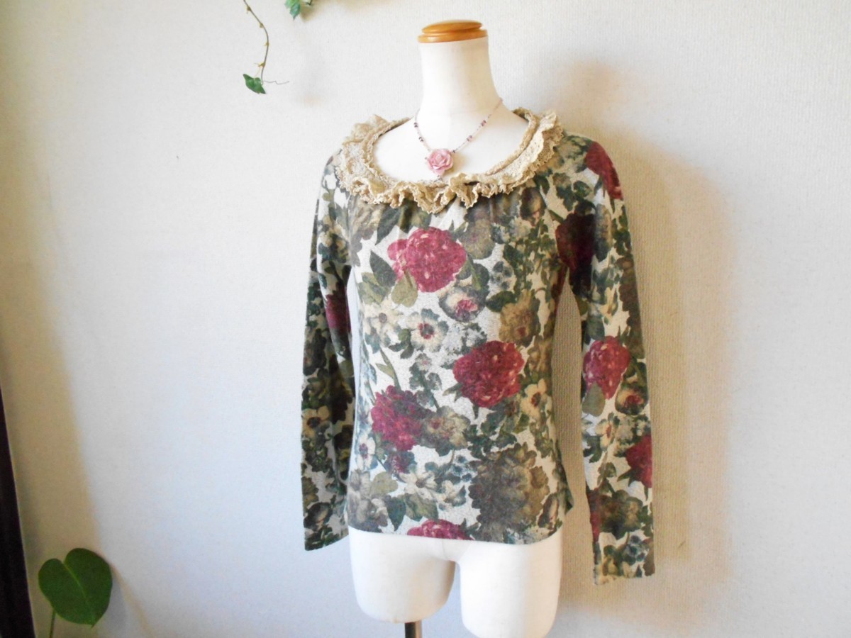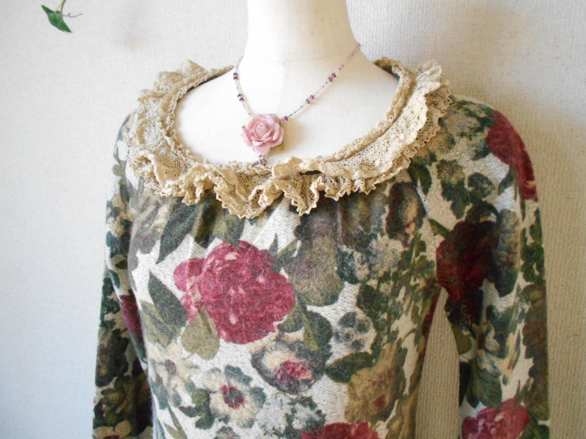 【ポイント】レストローズの薄手セーターになります。お色は多色使用の花柄で、長袖の秋冬向きです。