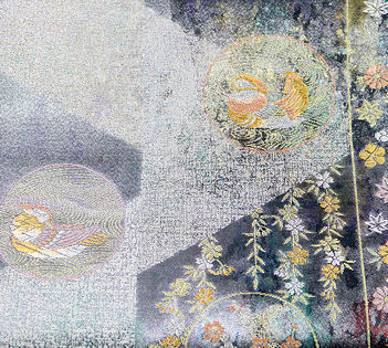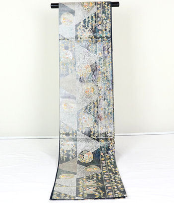 | 色・柄 | 西陣織袋帯 大原野蒔絵文 濃紺・グレー・金箔・銀箔地縫い取り花鳥丸紋 (写真では上手く色が出ない場合があります。ご了承下さい) ※お使いのディスプレイの種類や設定の差により 実物の色と画像の色が少々異なることもございます。 写真の枚数が多いので一度パソコンでご覧ください。 |