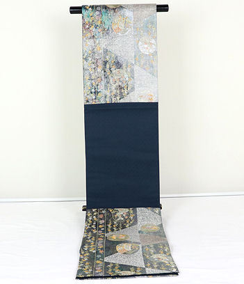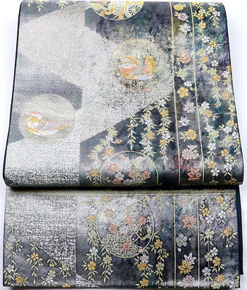 | 西陣織袋帯 大原野蒔絵文 濃紺・グレー・金箔・銀箔地縫い取り花鳥丸紋 新品 仕立て上がり | |