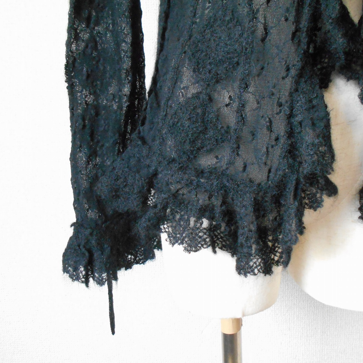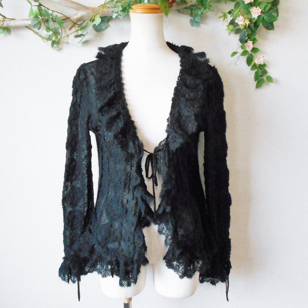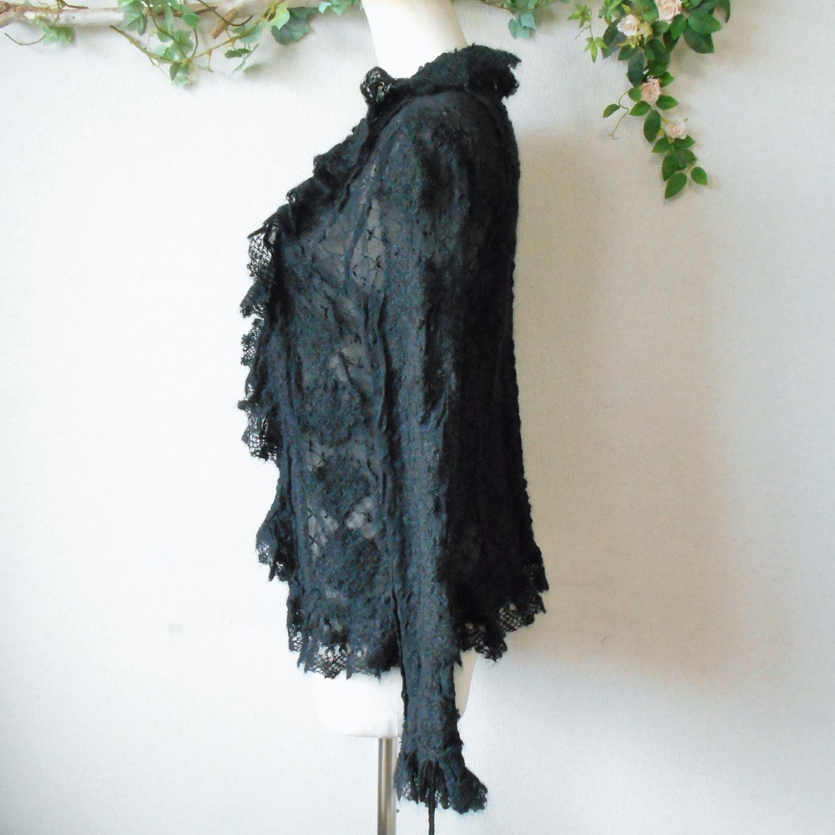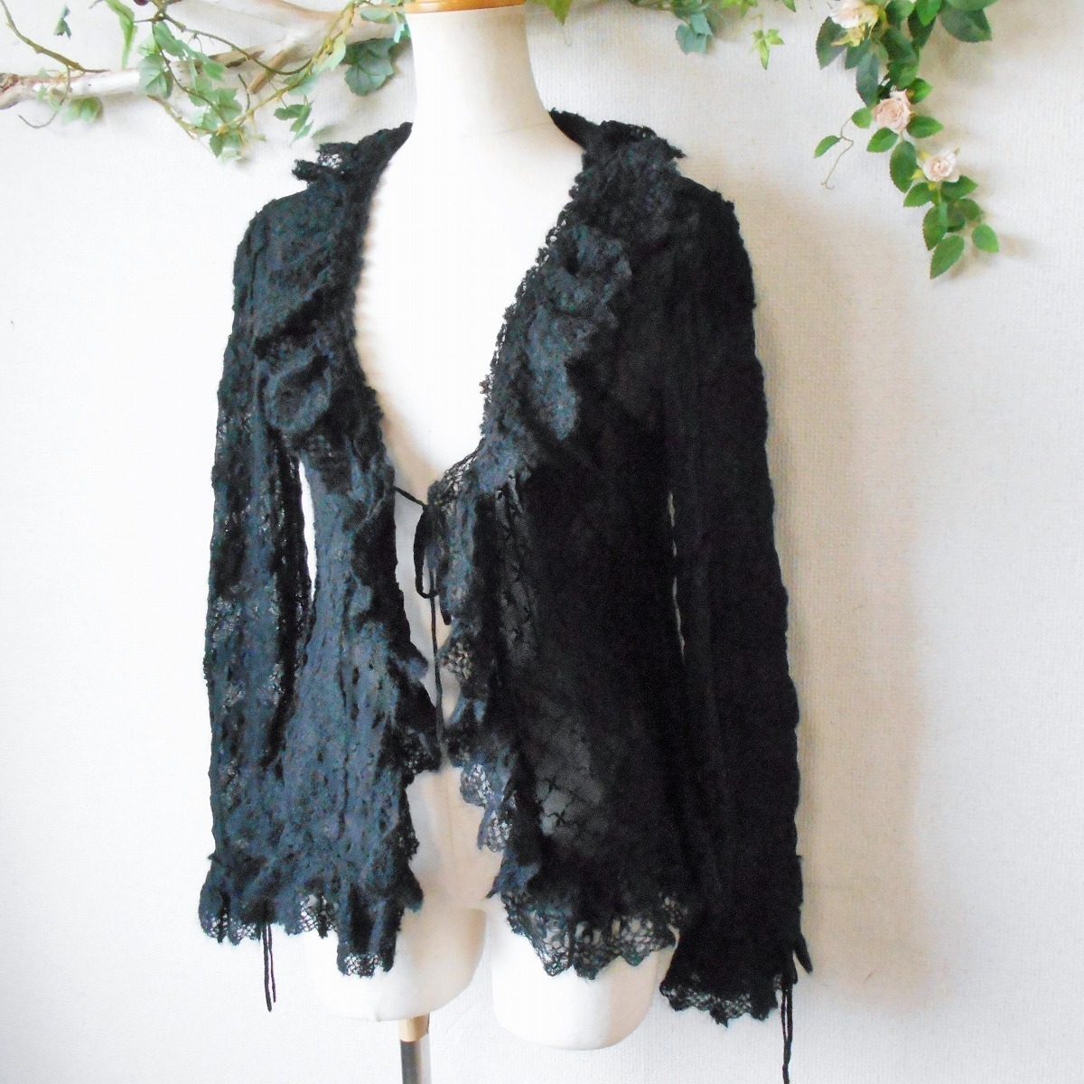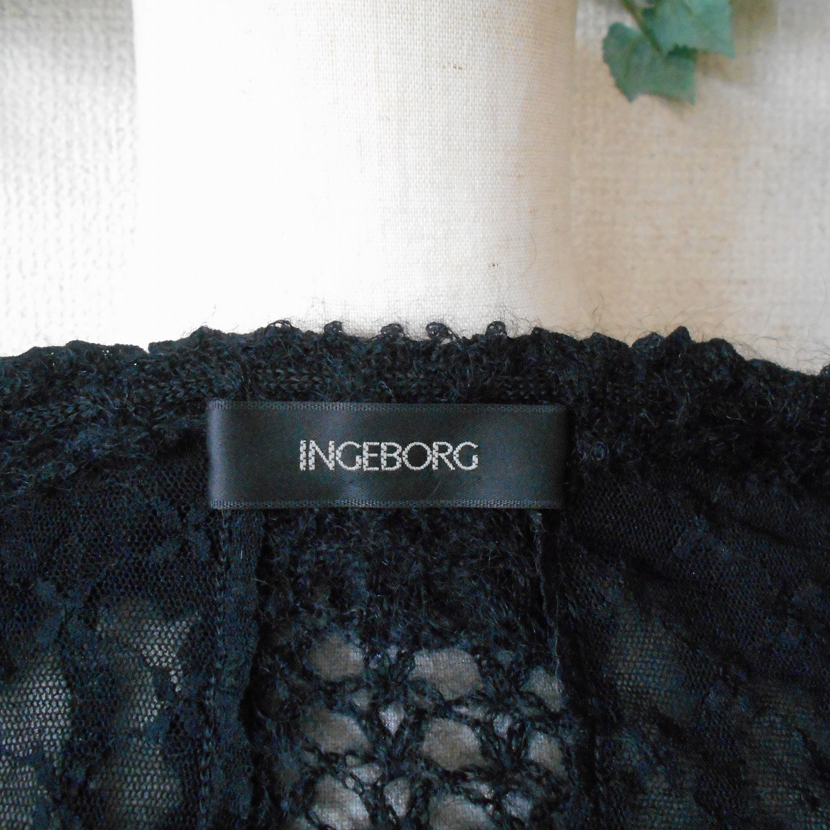 【ポイント】インゲボルグのカーディガンになります。お色は黒色で、フランス製のチュール生地がベースになっていて、モヘヤ等の使用された秋冬向きです。前はボタン等はなく、1つリボンが結べるデザインで、羽織る感じで着ていただきます。
