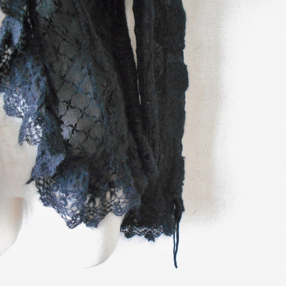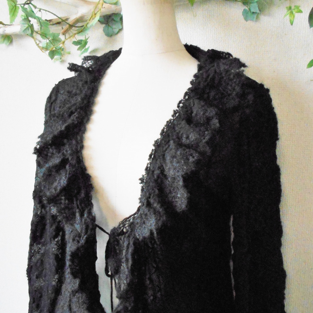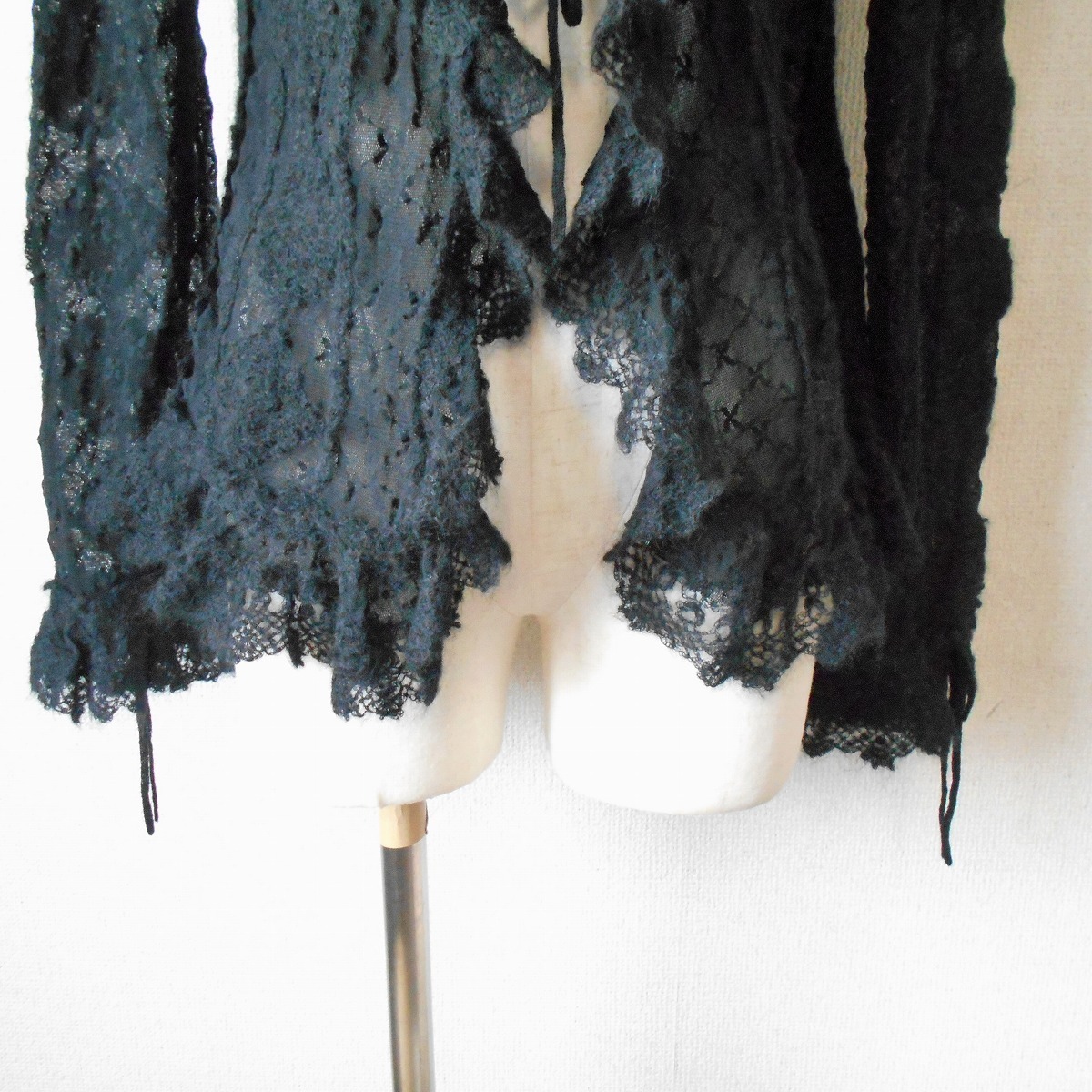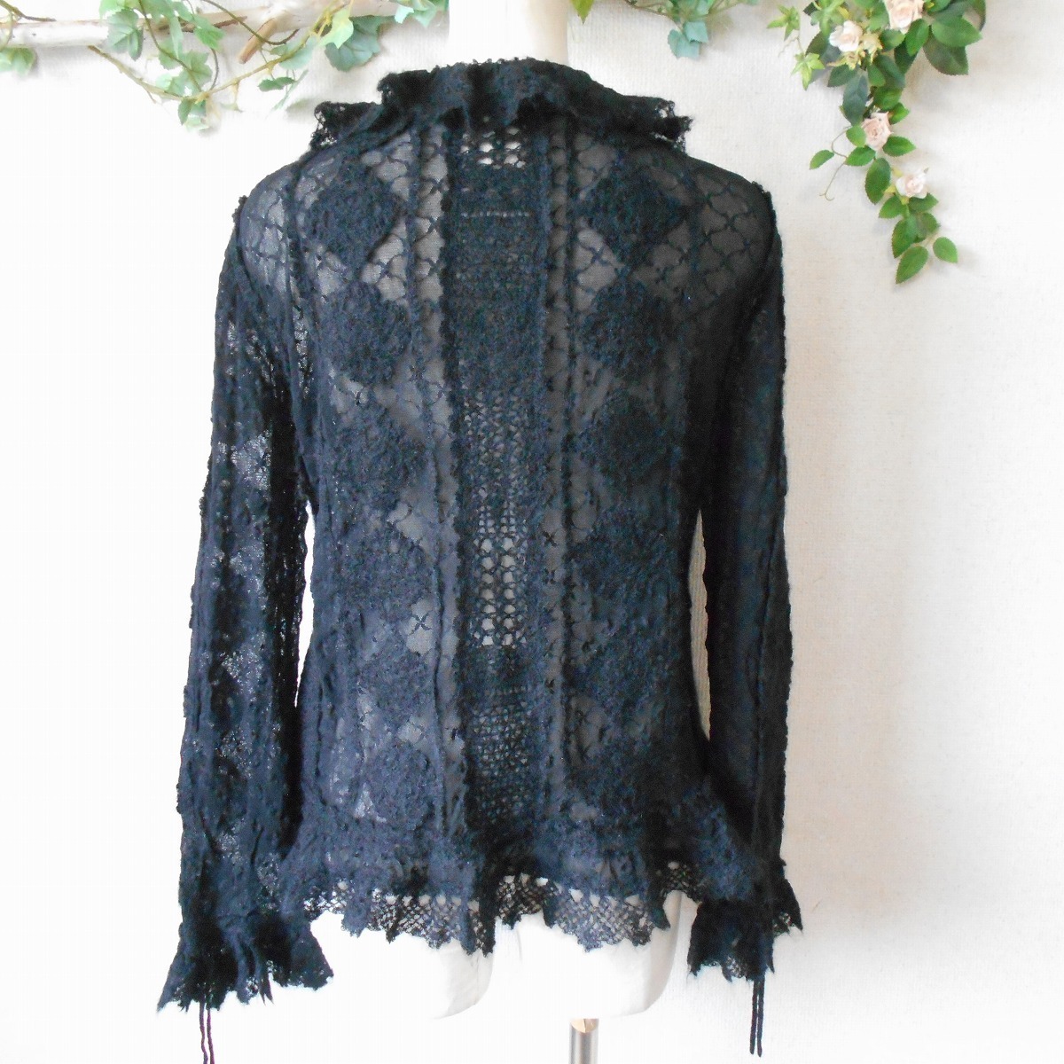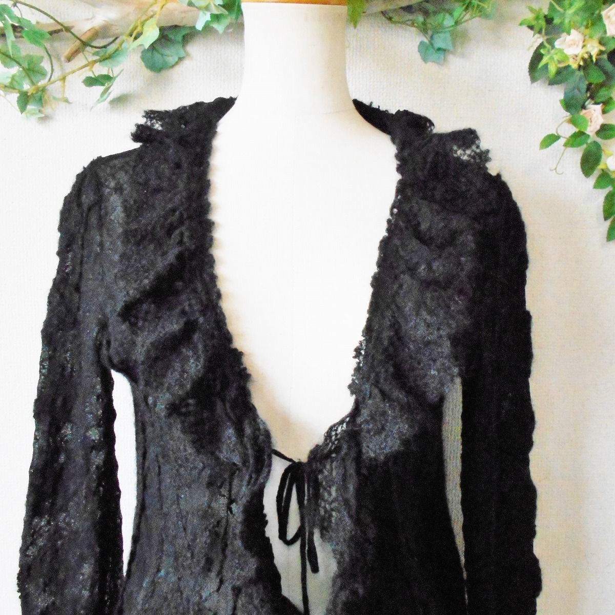 【ポイント】インゲボルグのカーディガンになります。お色は黒色で、フランス製のチュール生地がベースになっていて、モヘヤ等の使用された秋冬向きです。前はボタン等はなく、1つリボンが結べるデザインで、羽織る感じで着ていただきます。