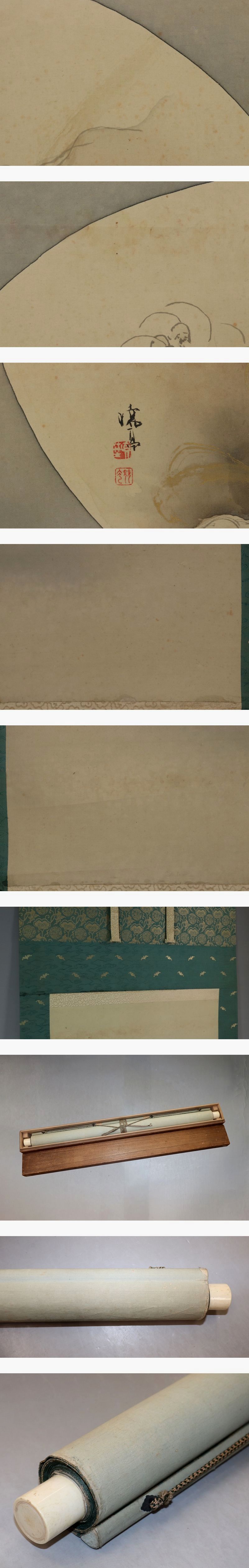 真野暁亭 まの-ぎょてい(1874-1934) 明治時代の浮世絵師、日本画家。 江戸川橋に生まれる。河鍋暁斎及び久保田米僊の門人。 姓は真野、名は八十五郎。父の真野暁柳も暁斎の弟子。 日本画家の真野松司は長男、同じく日本画家の真野満は次男である。 本紙は、染み、汚れ、折れ、皺、ヤケがあります。 表装は、染み、汚れ、折れ、皺、虫食い、ほつれ、軸先に汚れと小傷があります。 【サイズ】 作品 横約55.5cm×縦約110cm 表装 横約70.5cm×縦約202cm |