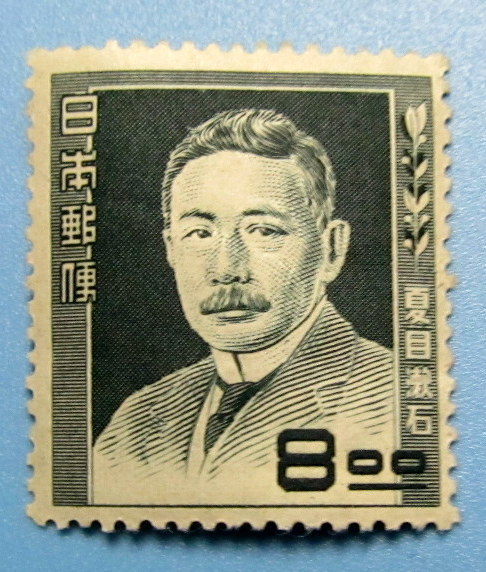 文化人切手 8円  夏目漱石 裏のり無し ヒンジ跡 丸まり 未使用