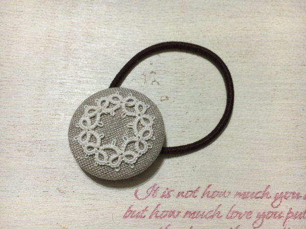 リネンのベージュ色の生地にタティングレースをつけたヘアゴムです。