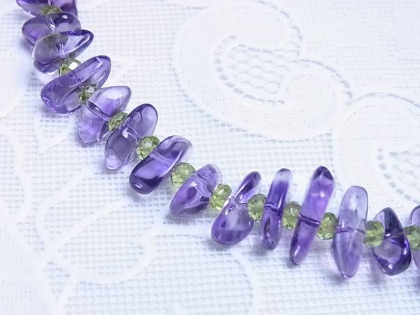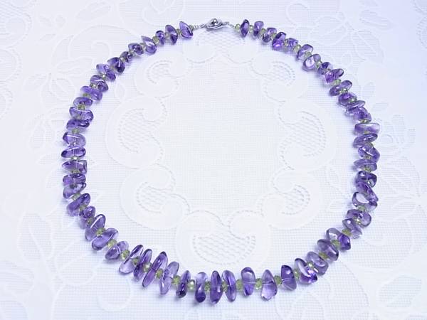 【数量限定販売になります】 天然アメシストのサザレの間に天然ペリドットのファセットビーズを使った、存在感のある個性的なネックレスです。 一般的にビーズに使われるアメシストは、 クラックやインクルージョンが多い品質の石が使われていますが、このアメシストはビーズとしては非常にクリーンで高品質なアメシストを使用しています。 また一般的なサザレは、尖った部分が多く肌にあたると痛いのですが、このサザレは綺麗に研磨してありますので、肌にあたっても痛くありません。 使用石 : 天然アメシスト 180ct以上使用 天然ペリドット 長さ : 約45cm 最大幅 : 約14mm 形状が不定形の為、目安になります 留め金 : ホック式 地金 : ブラス メッキ : ロジウム・コーティング 重量 : 約43g (平均値) 参考小売価格 : 14000円 クラックやインクルージョンが確認できますが、天然石の証明です。 鑑別機関の最高峰 「中央宝石研究所」 で鑑別をして、間違いない商品を供給してくれる、信用できるサプライヤーから仕入れをしています。 【備考】 誠に勝手ながら、土、日曜日、祝日、長期休暇は、 発送業務をお休みさせていただいておりますので、ご了承下さい。 画像はサンプル画像ですが、サンプル画像と遜色のない商品をお送りします。 出来るだけ実物に近い画像を使っておりますが、実物と多少色が異なる場合がありますので、ご了承下さい。 環境に配慮して、必要以上の梱包をしておりませんのでご理解下さい。 基本的にはチャック袋等に商品を入れ、緩衝材で壊れないように保護してお送り致します。 プレゼント梱包はご対応しておりませんので、ご了承下さい。 スムーズなお取り引きを心掛けておりますが、仕事の都合上、ご返信、発送等に 多少お時間を頂く場合もあるかと思いますが、ご理解の程、よろしくお願いします。 ノークレーム、ノーリターンでお願い致します。 | |||
