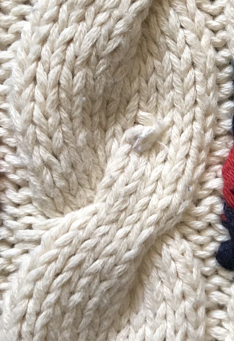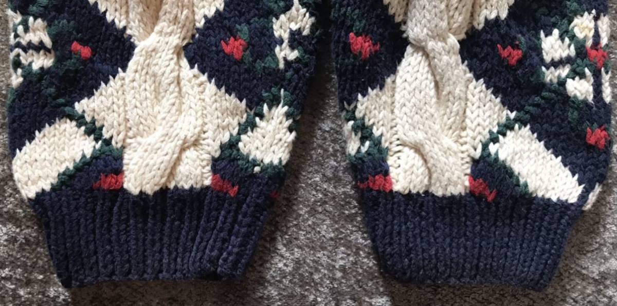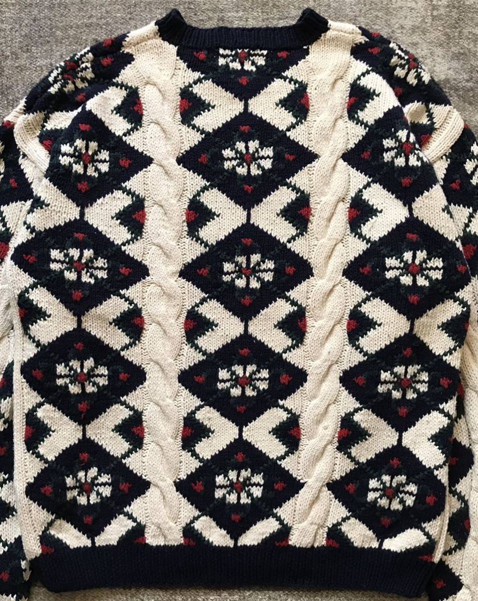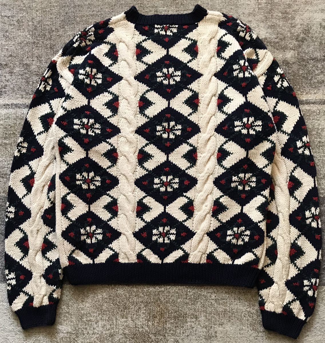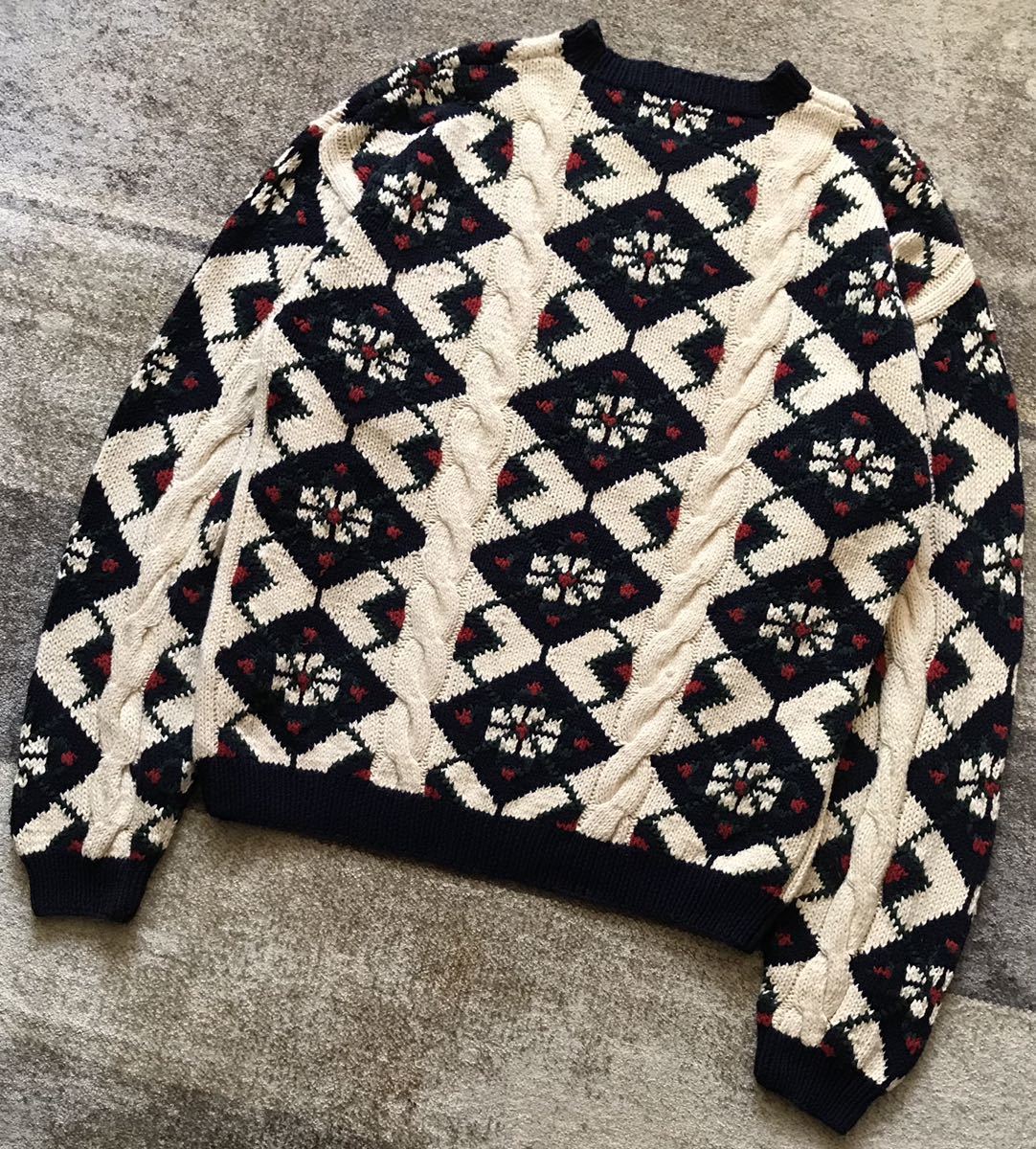 爽やかなホワイトベースのボディに、ネイビー×グリーン×レッド×ホワイトでデザインされたアーガイル柄、フロント、袖に配置されたケーブル編みが絶妙に効いた、圧巻のデザインセンスを感じる素敵なvintageアイテムです。