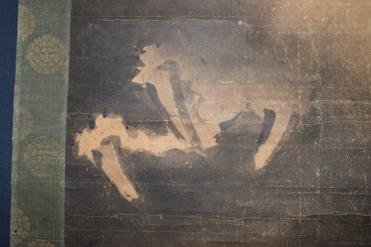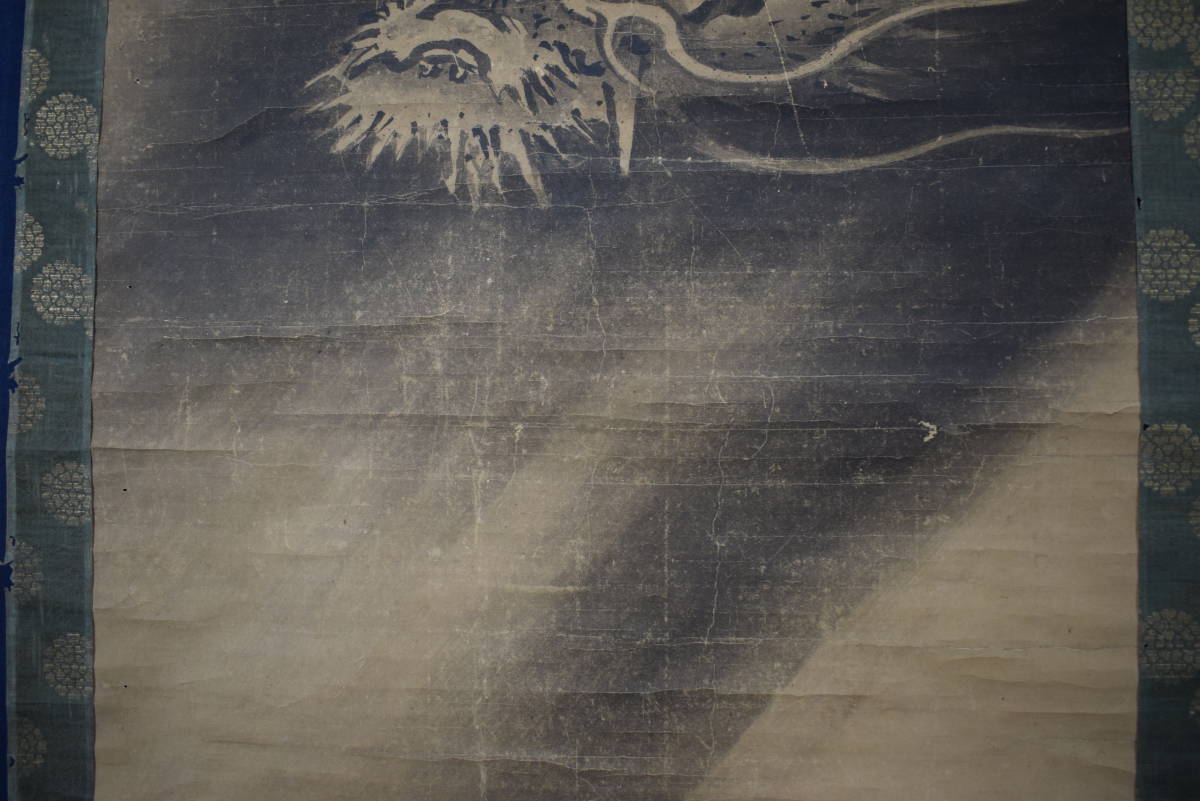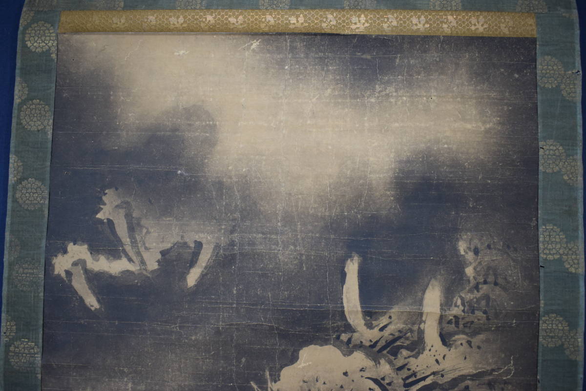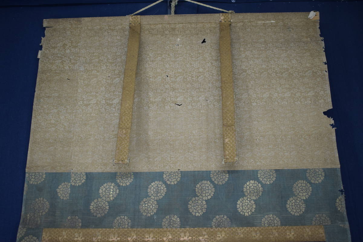 【作品状態】 本紙は紙本肉筆です。本紙は時代感あり、全体に多数の折れ、巻シワあります。表装は絹表装で、多数の虫穴あります。天地に多数の虫穴、欠損あります。