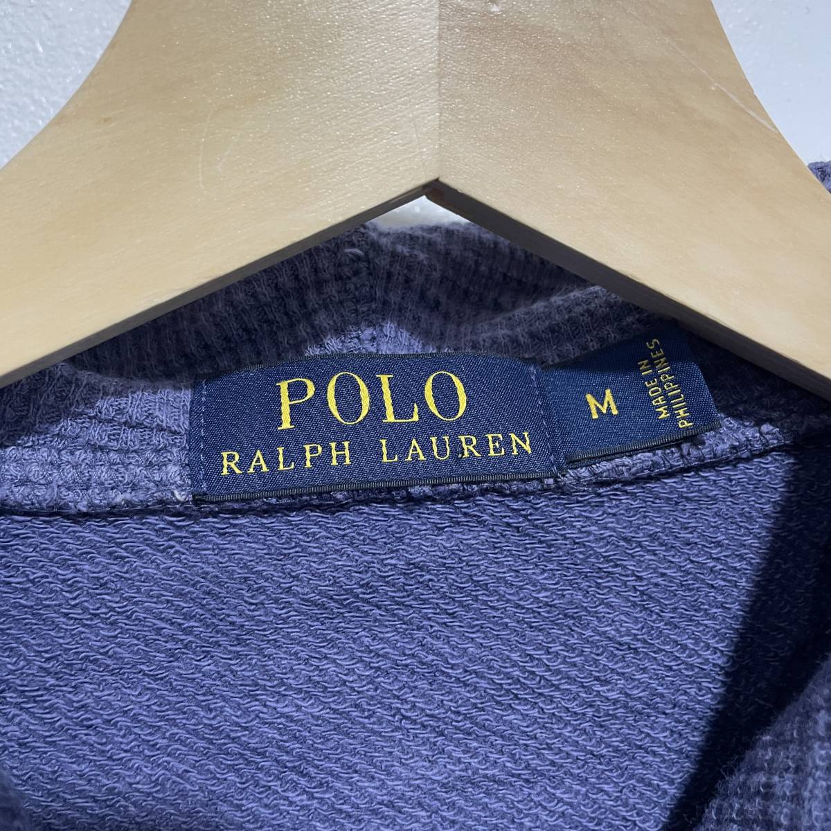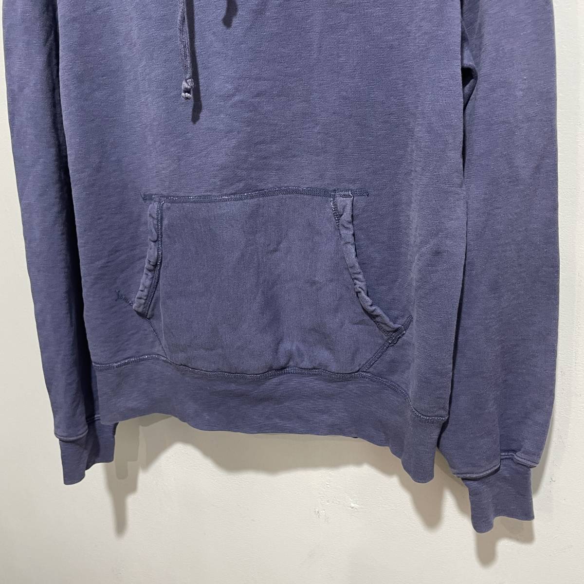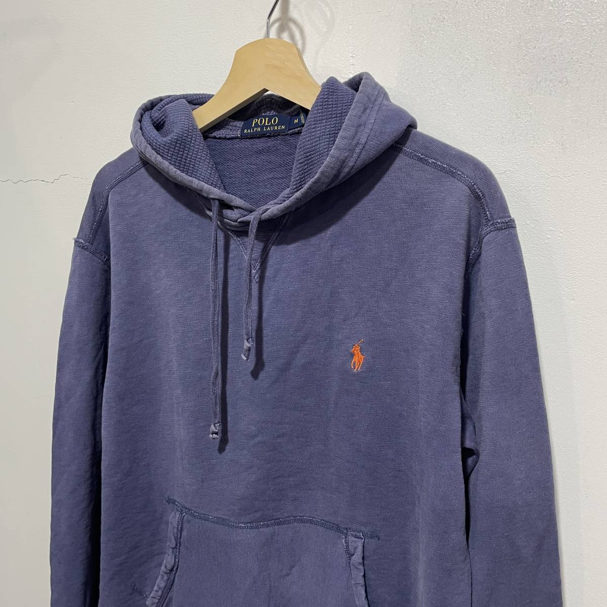 ラルフローレンのビンテージ加工スウェットパーカーになります。ウォッシュ加工により、ネイビーが色落ちして紫かかったような薄いカラーになっています。ポケットの縮みなんかもよく再現されていてかっこいいです。フードの中はサーマルのような素材になっていますが、スウェット自体は裏起毛とかではないので春などに軽めのパーカーとして着れます。すっきりとしたシルエットなのでおすすめです。