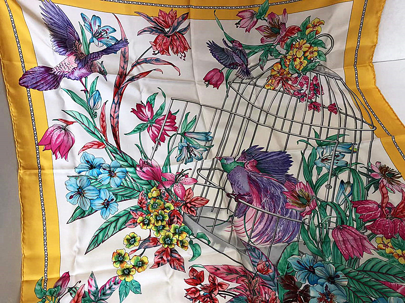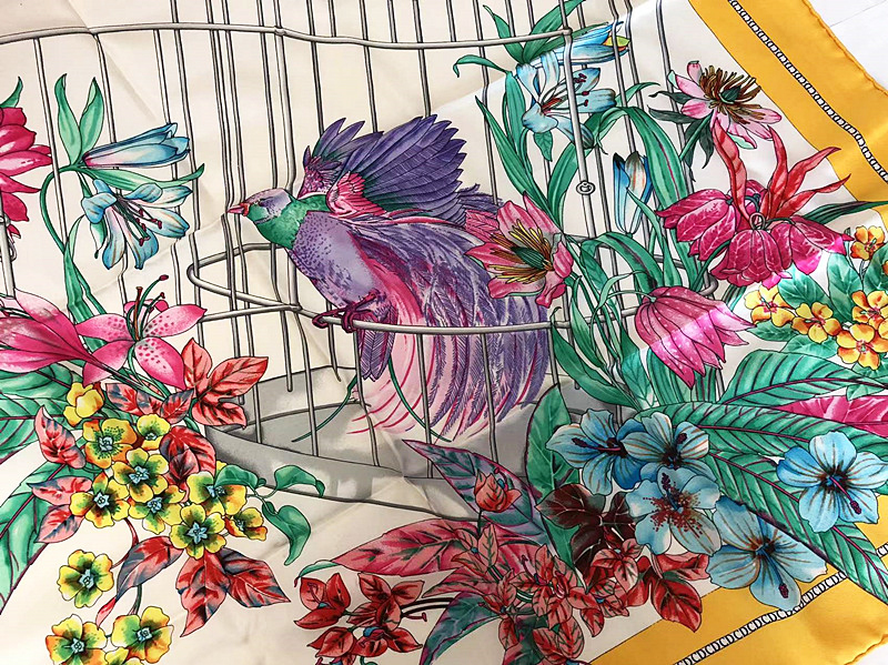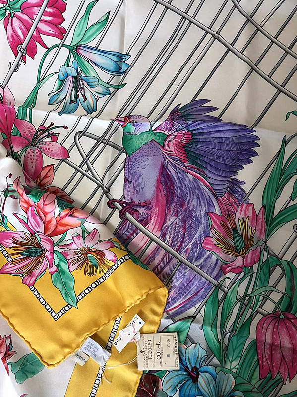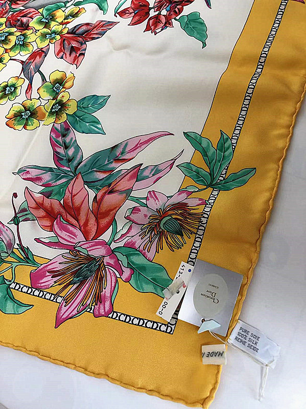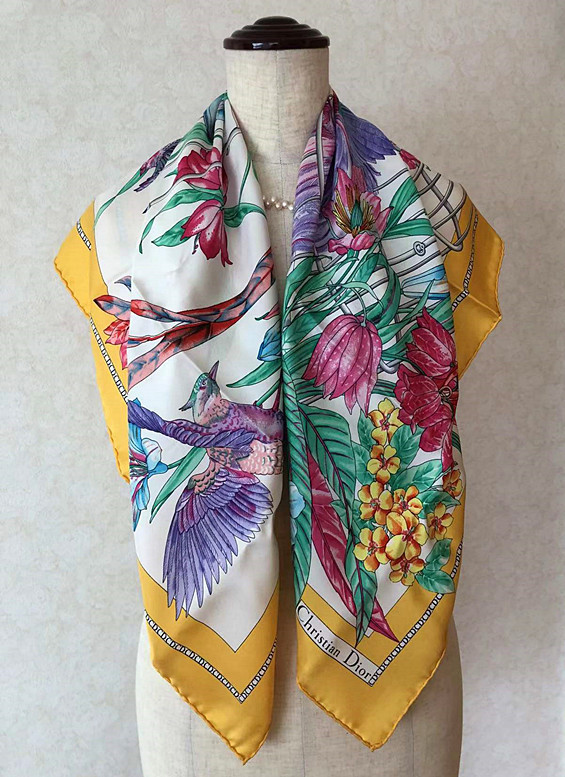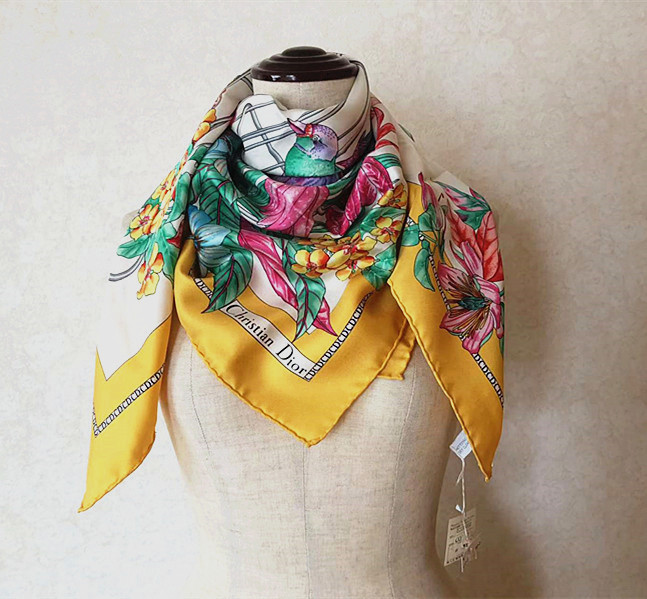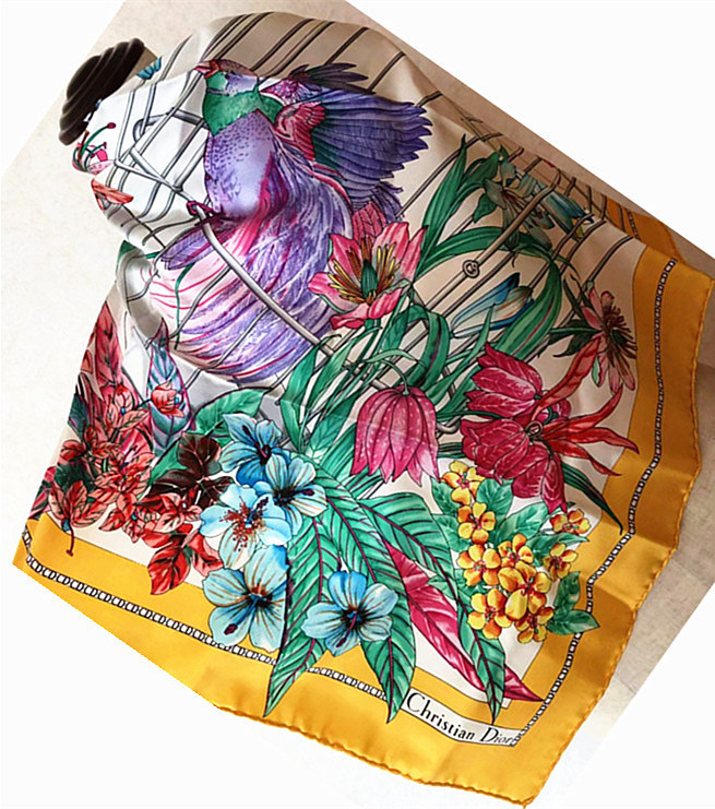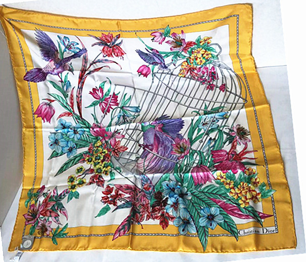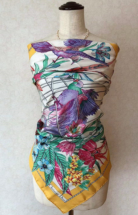 新品タグ付きイタリア製クリスチャン・ディオールChristian Dior★レア柄鳥&花柄シルクスカーフ●サイズ86×88㎝