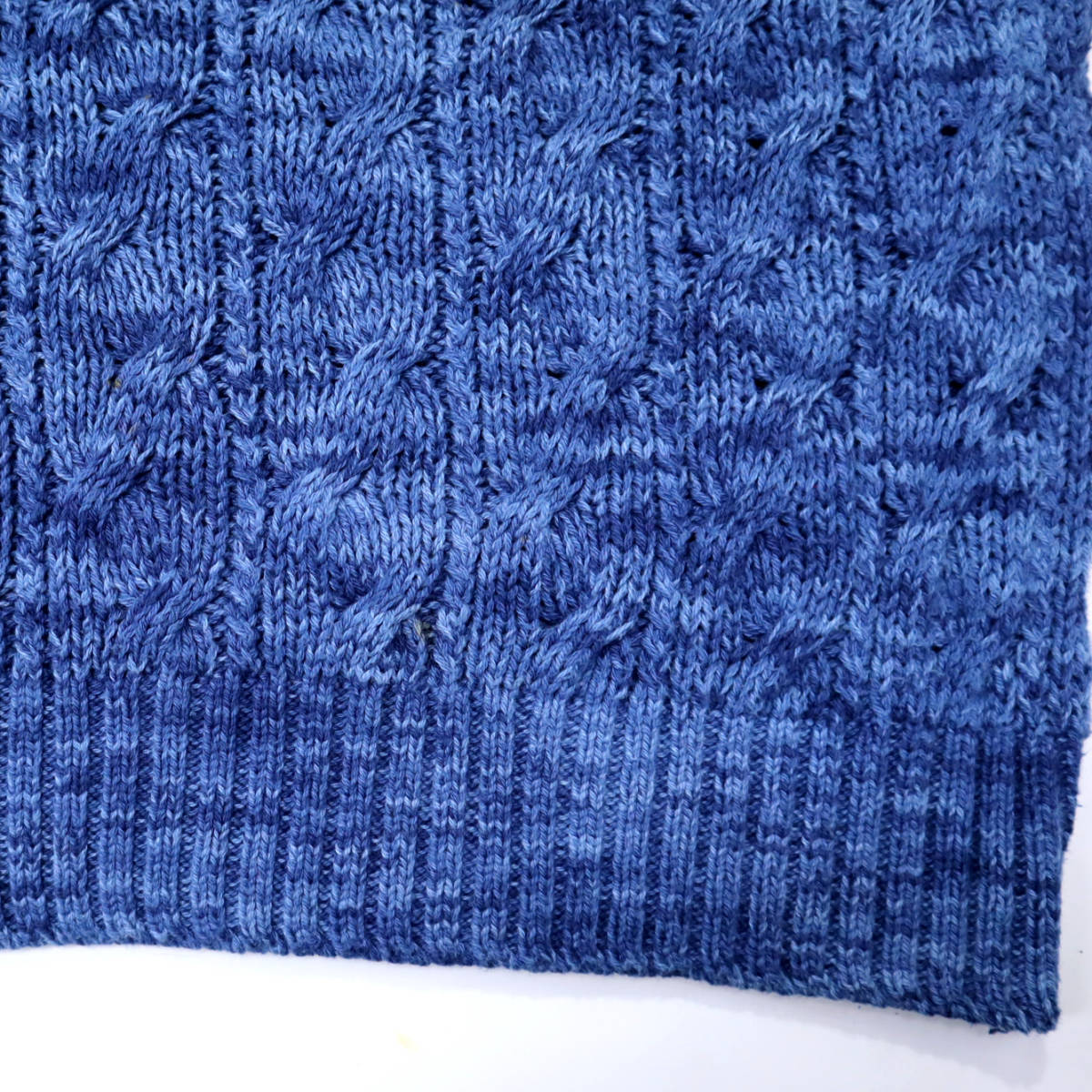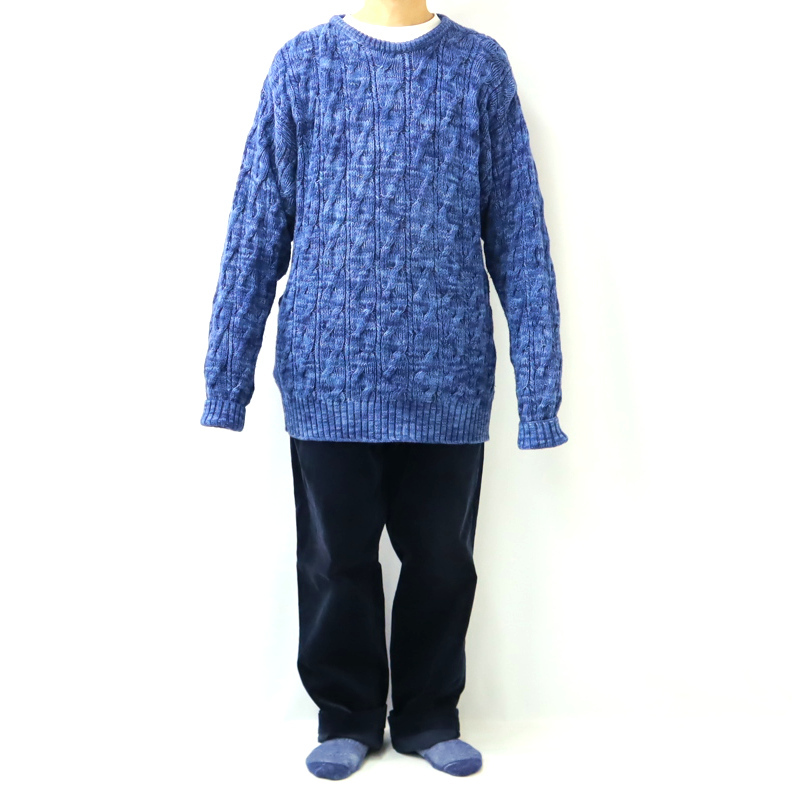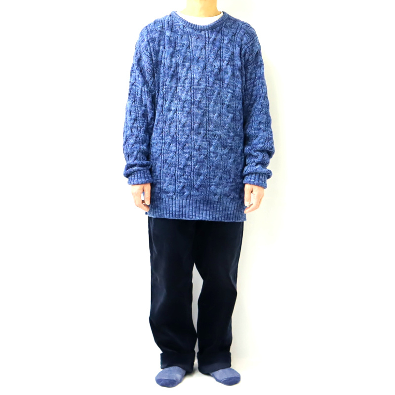 チャップスのセーターです。ラルフローレンの大衆向けラインとしてスタートしたブランドです。こちらはUSA製で、ラルフネームがタグに入る時代の貴重な一着です。素材はコットン、人気のインディゴニット、ケーブル編みと凝った作りです。サイズ表記はXL、画像では171㎝60キロが着用しており、結構大きめのサイズ感です。オーバーサイズで着るくらいが可愛いので、ダボっと着ることが出来ます。袖が長めですので、折ったり、たるませてご着用下さい。色味や雰囲気も良く、柔らかい素材で着やすいニットです。宜しくお願い致します。