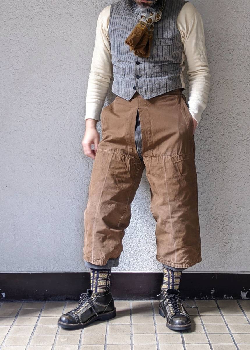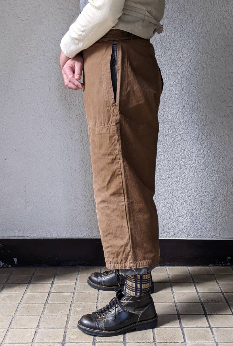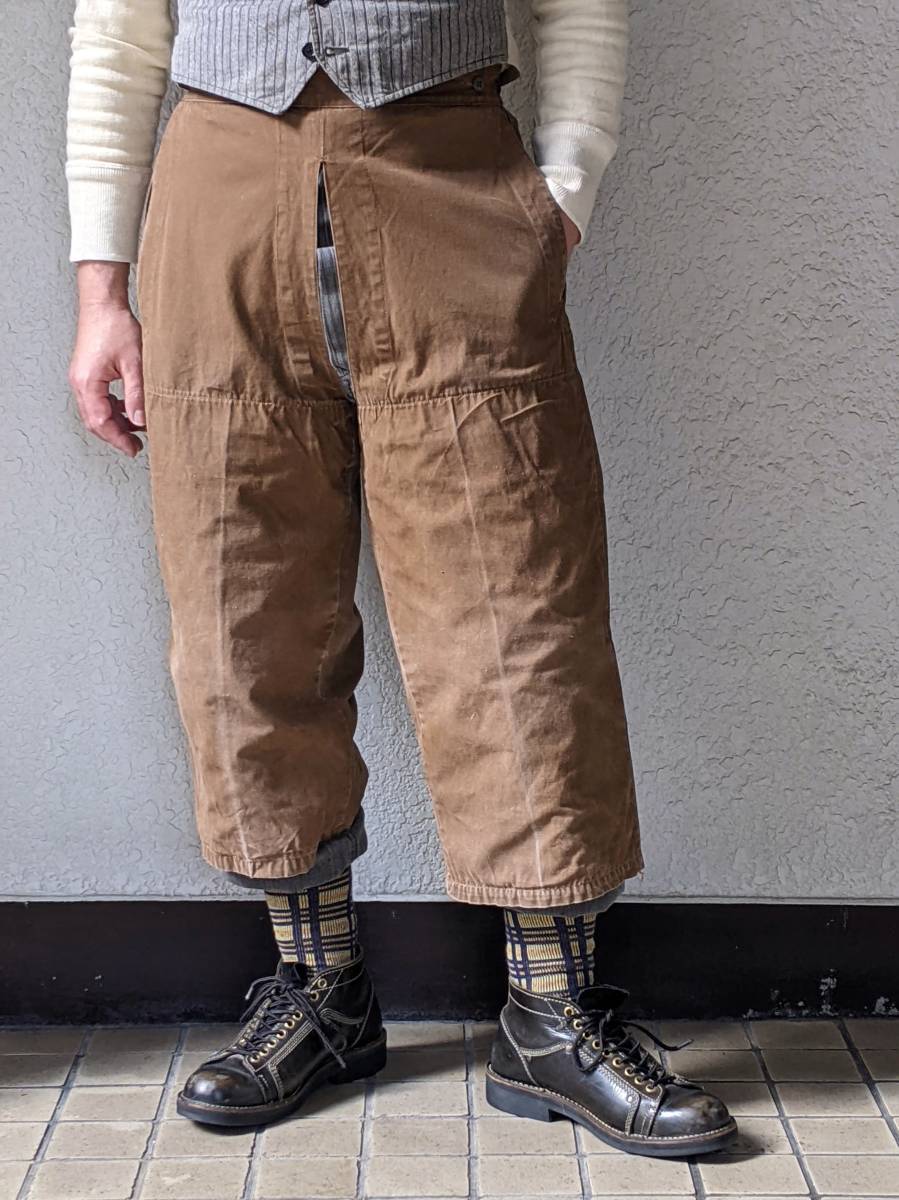 狩りやライディング等のワーク・ミリタリーシーンにて稀に見かける、ズボンを保護するため上から履く、所謂オーバーパンツです