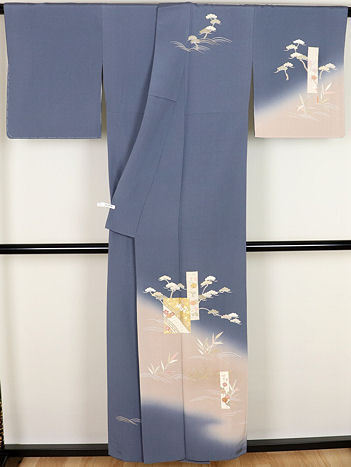 | 色・柄 | 友禅訪問着 袷 丹後縮緬地 グレーぼかし地菊・松竹梅・花短冊 (写真では上手く色が出ない場合があります。ご了承下さい) |