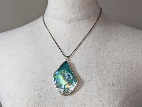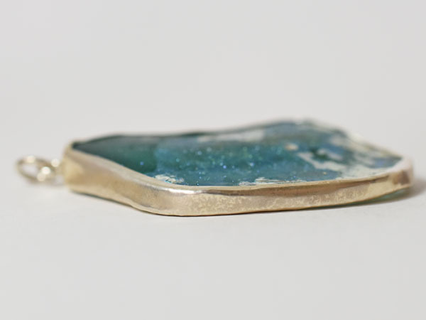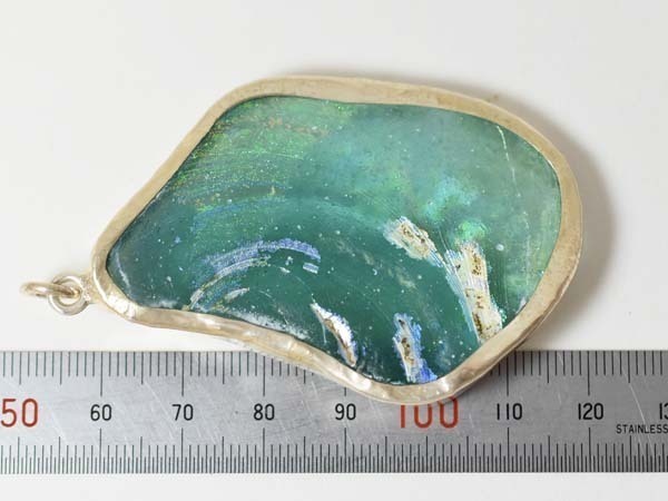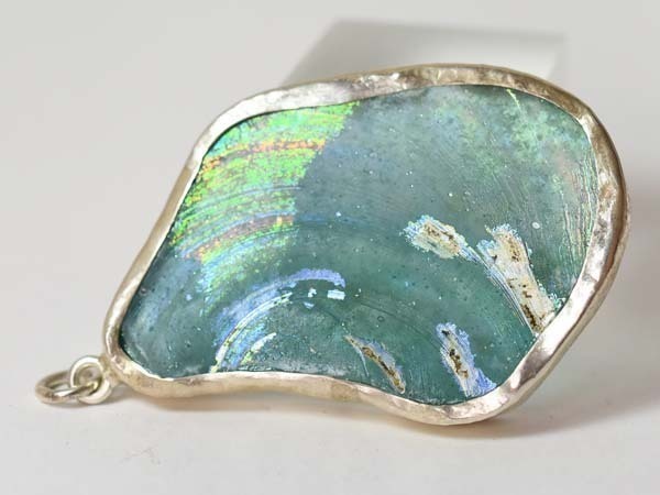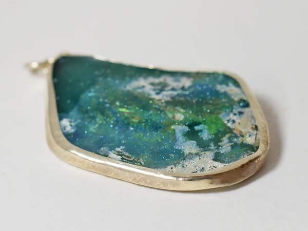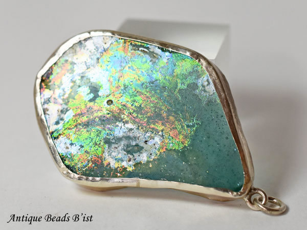 両面に神秘的な銀化が見られる、セミクリア薄緑色のローマンガラス器の大型残欠片ペンダントTOPです。優雅で美しい銀化の輝きは大変神秘的で、人間と自然が作った、2000年の時を経た神秘をお楽しみいただけます。銀化は角度を変えることにより多彩な表情を見せてくれます。