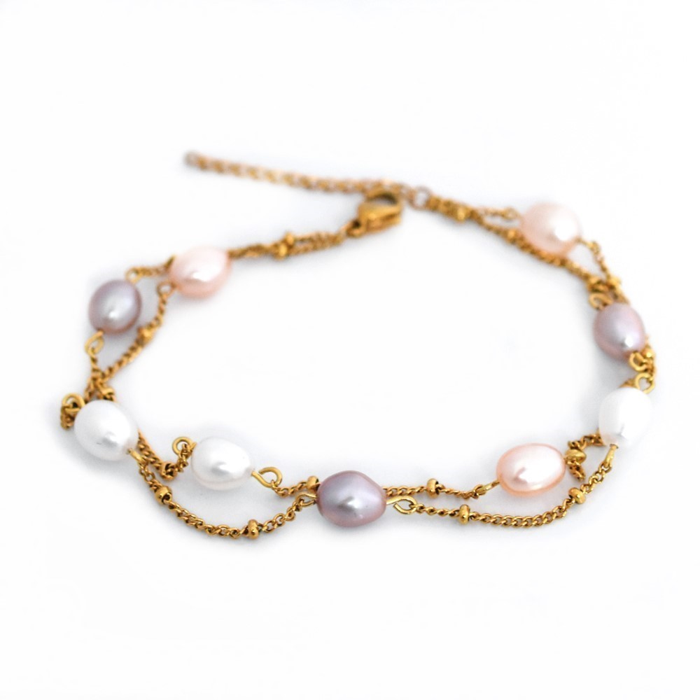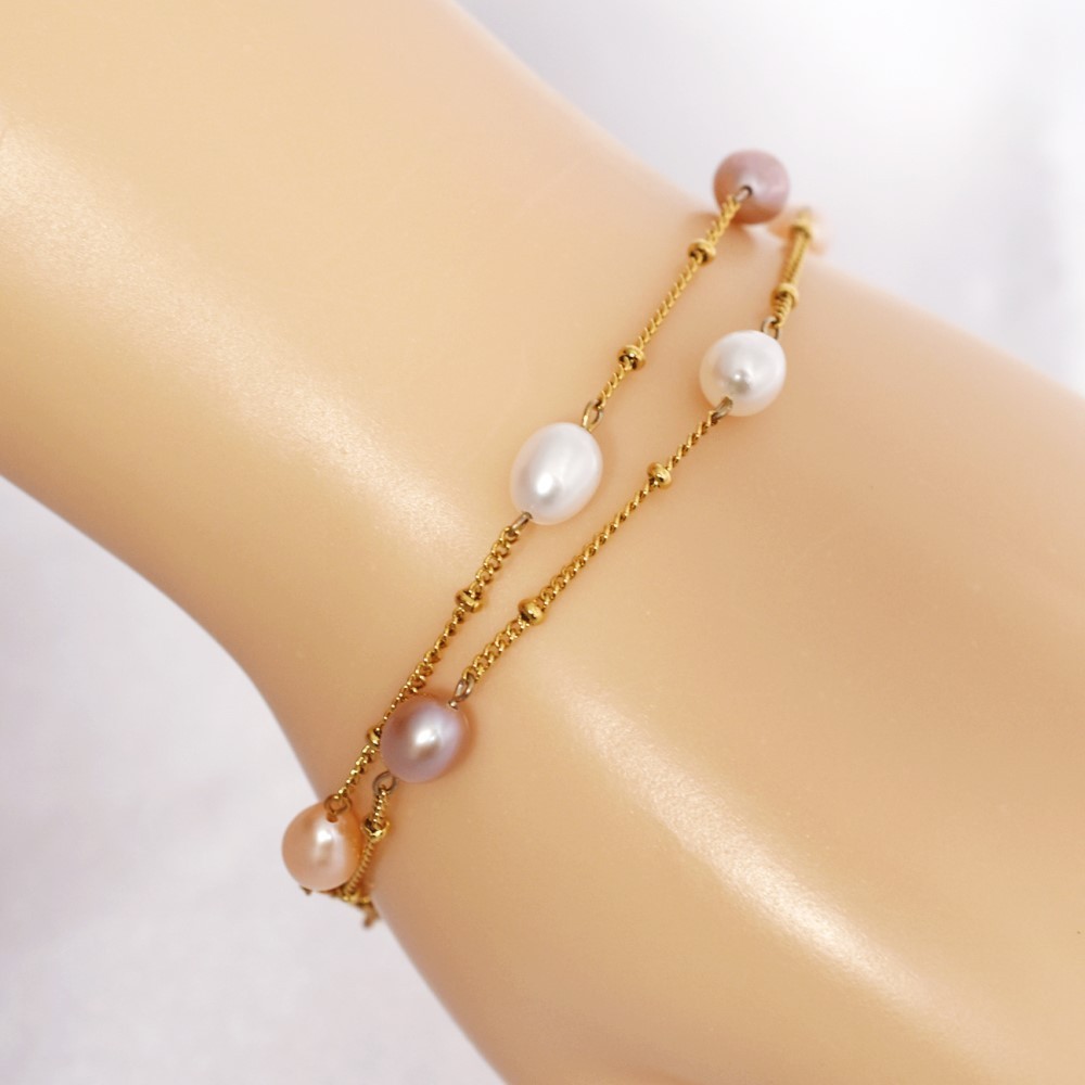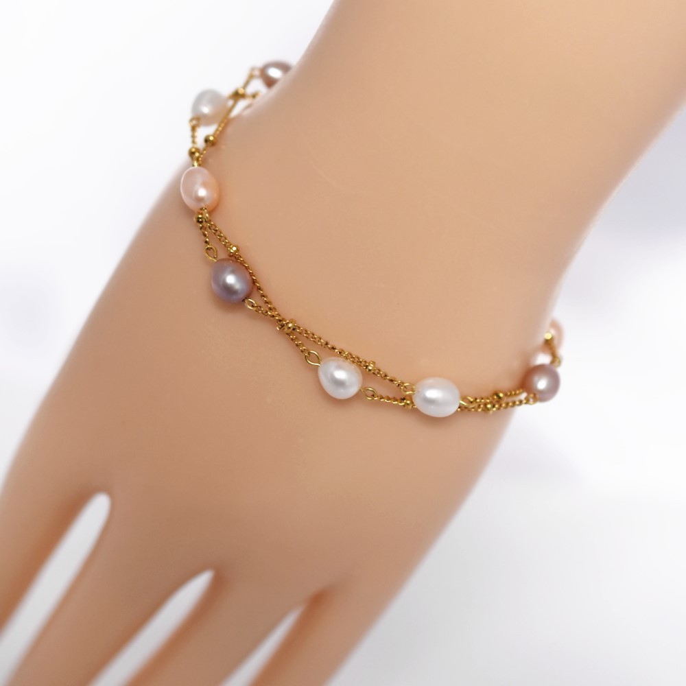 ●金属素材:ステンレス、14KGF。●淡水真珠 :約6x6x8mm(天然の真珠であるため。それぞれのサイズと色はわずかに異なります。予めご了承ください)。●サイズ:長さ17.5cm、 アジャスター3cm、全長約20.5cm(腕回り15.5cm~16.5cm最適)。