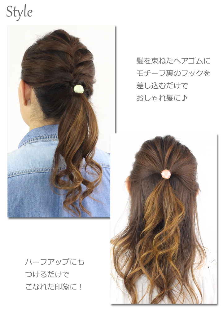 商品説明 | 使い方は髪を束ねたヘアゴムにモチーフ裏のフックをひっかけるだけ!! いままでのモチーフつきヘアゴムですとモチーフの位置や向きが思ったように決まらなかったり、 ゴムが伸びてしまって使えなくなってしまったりと。。。 そんな悩みをすべて解消してくれたのが『ポニーフック』新感覚アイテムです。 お団子やくるりんぱにつけたりと グッとおしゃれになりますので是非チャレンジしてみてください☆ また、単品使いはもちろんですが重ね付けすることでオリジナリティー感がでます!! |