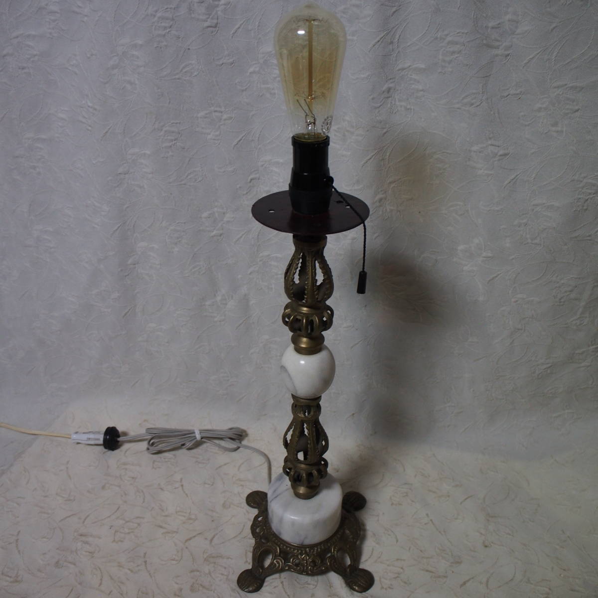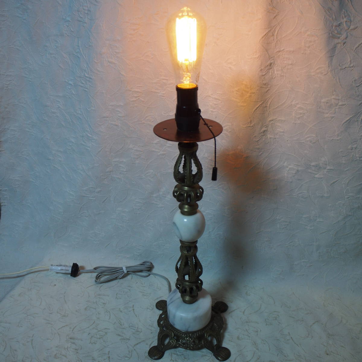 商品説明 ・・・ 状態良好な外装自作とした エジソン球 ( NEWな レプリカ球 L:13cm / 110V 40W / 旭光電機 製のカーボン球 ) を使用した 一灯式のアンティークな照明器です。手持ちパーツを組み立てとした外装程度の方は、真鍮部や大理石部に於いて 年代経過による多少なりの使用感は有りますが 状態の良い照明器と成っています。大きさは、台座部の大きさで 最大直径 20,5cm / 高さ 59,5cm、重量 凡そ 2Kgと成っています。 チェック&クリーニング済みの 外装自作とした エジソン球 ( NEWな レプリカ L:13cm / 110V 40W / 旭光電機 製のカーボン球 ) を使用した 一灯式のアンティークな一等式 照明器は如何でしょうか ・・。( 電球のコントラストの関係で、写真撮りに見苦しい所が有りますが ご容赦ください ・・ )