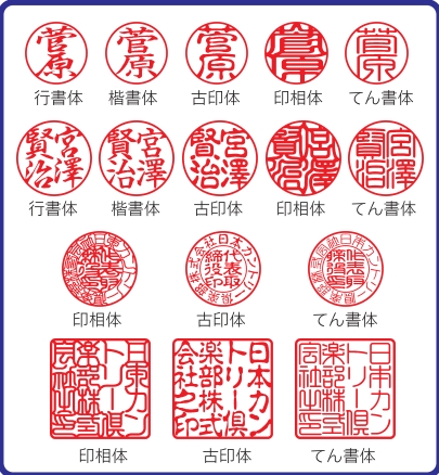 印相対・篆書体・古印体・楷書体・行書体・隷書体・書体印影集をご参照の上後程メールでご指定下さい。