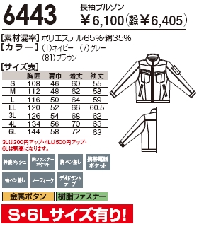 新品☆SOWA 長袖ブルゾン 作業着 S~6L ワーキング 6443