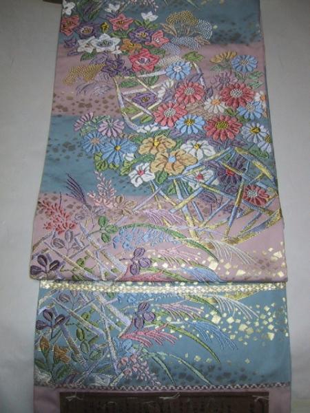 唐織本物志向の方に、一度は手のとっていただきたい一品です。この機屋は山城機業店、西陣証紙番号216番です。『嵯峨野花篭文』と題されたこのくすんだ水色+くすみ肌ピンク地に、山城ならではの色使いが生えます。絹100%。新品み仕立て。唐織ですのであまり細かいことにこだわられる方には、適しません。(派手向きでないのも出品です) 六通柄袋帯