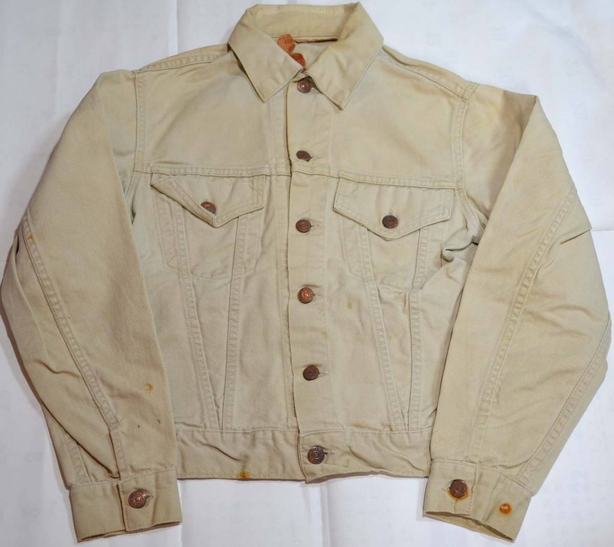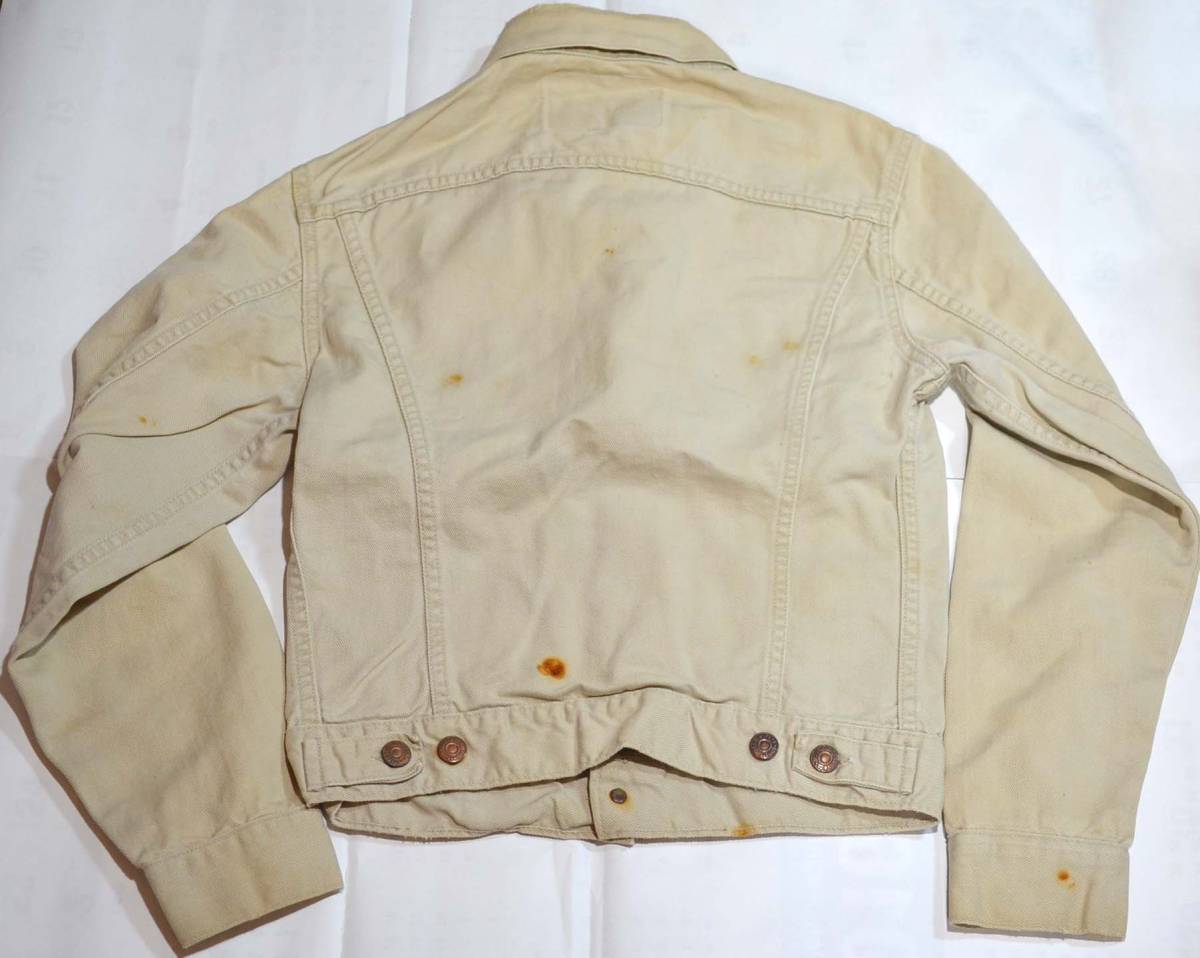 60'sの840BXXです。復刻、レプリカではありません。『ディテール紹介』ボタン裏の刻印O、デカパッチ。赤タブは元々付いておりません。『状態』襟にリペア(あまり目立ちません)、錆汚れの付着があります。 その他=スレ、キズなどUSED感があります。『色落ち、特徴など』サードのホワイトツイルバージョン、840BXXです。このサイズは本当に希少です。細身の方がピッタリ小さめに着用するのに最適です。 さすがXXだけあり、ヴィンテージのオーラがあります。ジーンズの上着として最適だと思います。※パッチはカチカチに硬化しており、お届け時には割れや欠けが進行している可能性があります。取り扱いには十分注意しますが、 ご了承下さい。