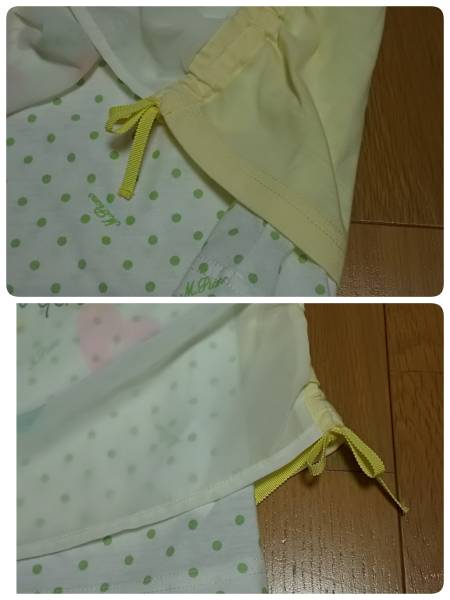 両サイドの裾はシャーリングになっていて、黄色いリボンがアクセントになっています。