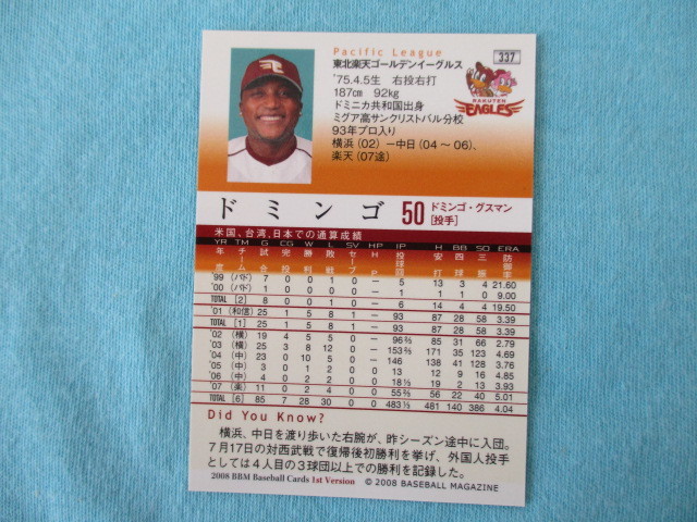 ★BBM 2008★1st Version〔337 ドミンゴ 東北楽天ゴールデンイーグルス〕トレカ♪