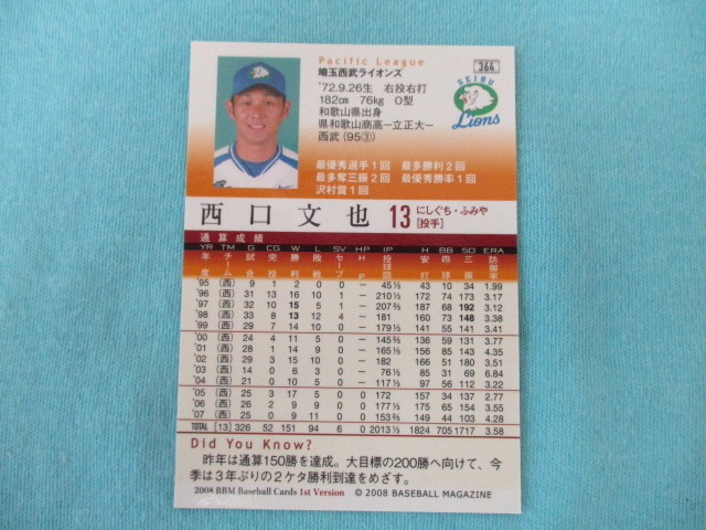 ★BBM 2008★1st Version〔364 西口文也 埼玉西武ライオンズ〕トレカ♪