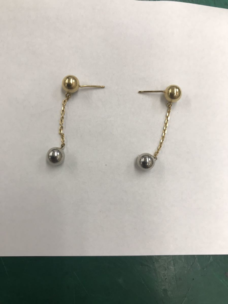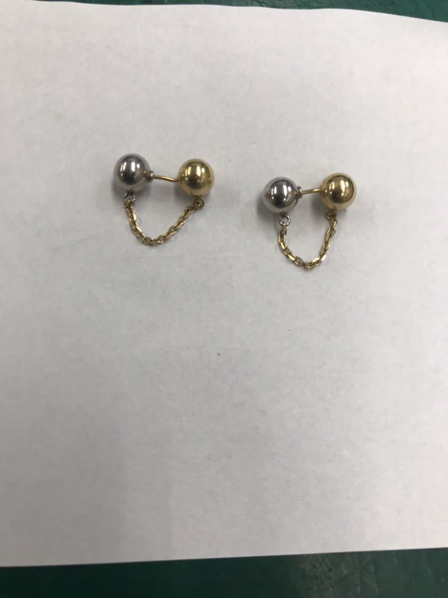 変わったデザインのピアスです。キャッチとピアスが一体化しており、どっちを前にしても可愛いです。素材は不明ですが、片方の玉はシルバー、それ以外はゴールドの色をしています。チェーンの長さは約2.2センチほどです。刻印などはありません。軸に少し歪みがありますが、着用には問題ありません。