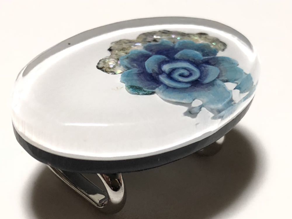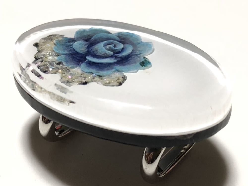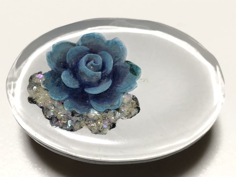 レジン細工、象嵌細工を施した、ブルーローズデザインの帯留めです。