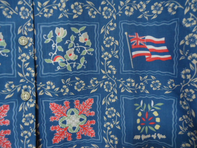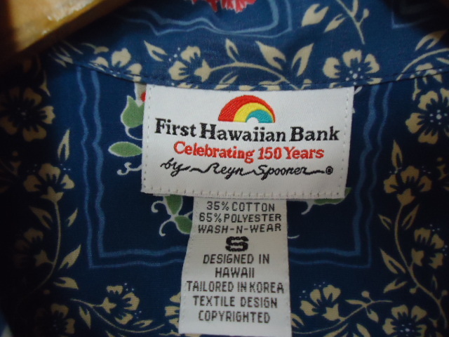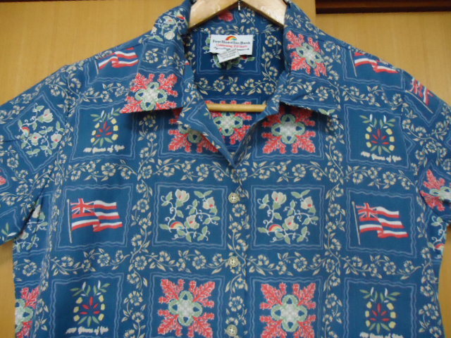 ハワイにて、古着として、購入しました。レインスプーナー社製。ファーストハワイアン銀行150周年限定物。オールオーバー。ロゴシェルボタン。コットン35%・ポリエステル65%混合素材です。カラーは、紺色地に、ロゴ・ハワイアンキルト・ハワイ州の旗・花・葉っぱ柄です。クリーニング済み。韓国製。なお、当商品のサイズ表示は、全てUSAサイズです。サイズ表示は、レディースのSですが、平置き実寸を重視して下さい。なお、少々誤差は、ご了承下さい。肩幅約42センチ・身幅(脇の下)約52センチ・丈約64センチです。目立ったダメージありませんが、USED物なので、古着に、ご理解のある方・24時間以内に、お手続き入力後、期限内にかんたん決済、出来る方のみ、ご入札をお願い致します。この商品は、1点物です。 ※※発送方法・送料は、レターパックライト郵便(追跡可能・補償無し)ですと、430円又は、レターパックプラス郵便(追跡可能・手渡し配達・補償無し)ですと、600円です。※※ ☆★★★★★☆送料は、変わりますが、何点でも、同梱包可能です。数点落札されましたら、まとめて取引を、選択お願いします。☆★★★★★☆