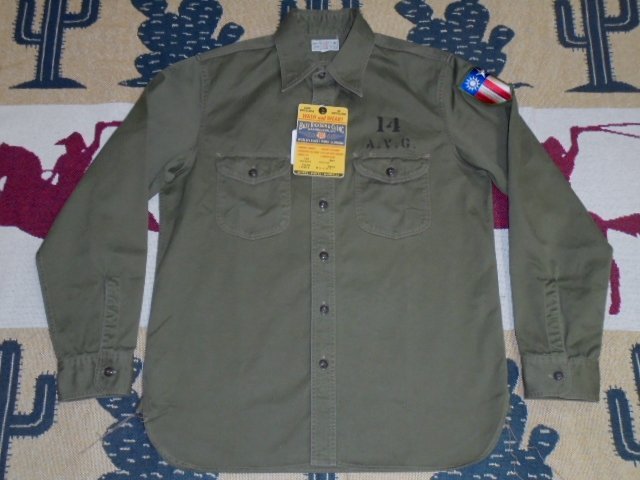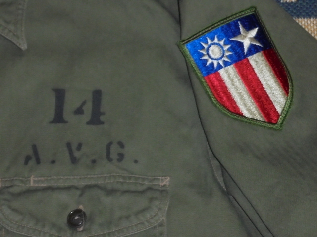 ステンシルプリントとワッペンが施されたミリタリーシャツ。肉厚で丈夫なヘリンボーン生地を使用。A.V.G.(American Volunteer Group/アメリカ合衆国義勇軍)をモチーフに、左胸とバックににステンシルプリント、左袖にC.B.I.戦区章のワッペンが配されています。裾の両サイドにマチが付きます。裾マチの部分に縫いっ放しで糸が飛び出ていますが、(空環縫い)これはヴィンテージのシャツによくある特徴で、あえて切らずに残してありますのでご了承ください。